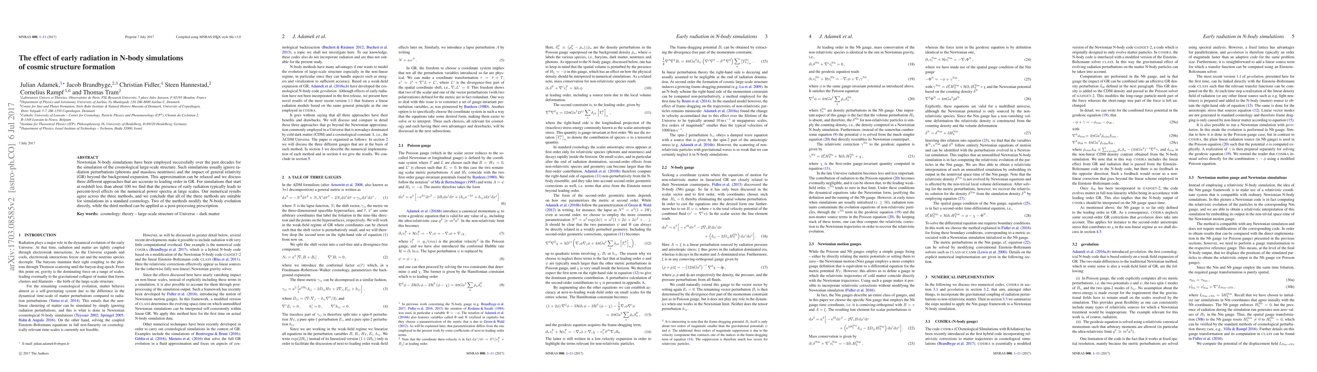 This paper investigates the impact of early radiation in Newtonian N-body simulations of cosmic structure formation, finding that it causes percent-level effects on large-scale power spectra. Three accurate methods for incorporating these effects are presented, all yielding consistent results and confirming their suitability for standard cosmological simulations.