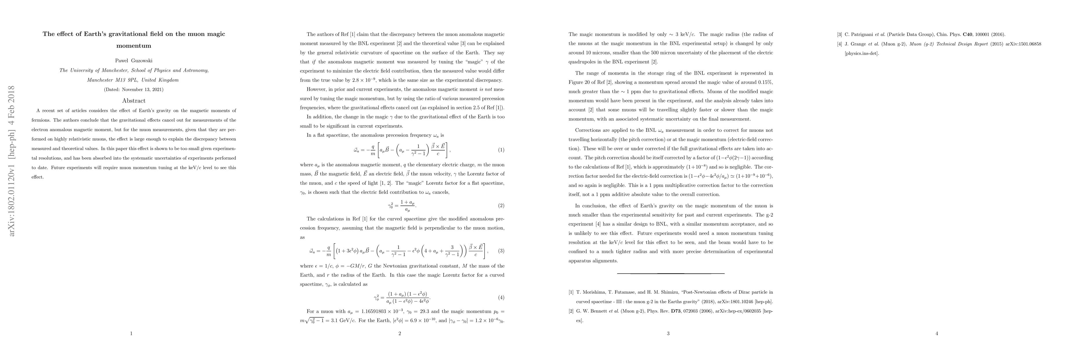 A recent set of articles considers the effect of Earth's gravity on the magnetic moments of fermions. The authors conclude that the gravitational effects cancel out for measurements of the electron anomalous magnetic moment, but for the muon measurements, given that they are performed on highly relativistic muons, the effect is large enough to explain the discrepancy between measured and theoretical values. In this paper this effect is shown to be too small given experimental resolutions, and has been absorbed into the systematic uncertainties of experiments performed to date. Future experiments will require muon momentum tuning at the keV/c level to see this effect.