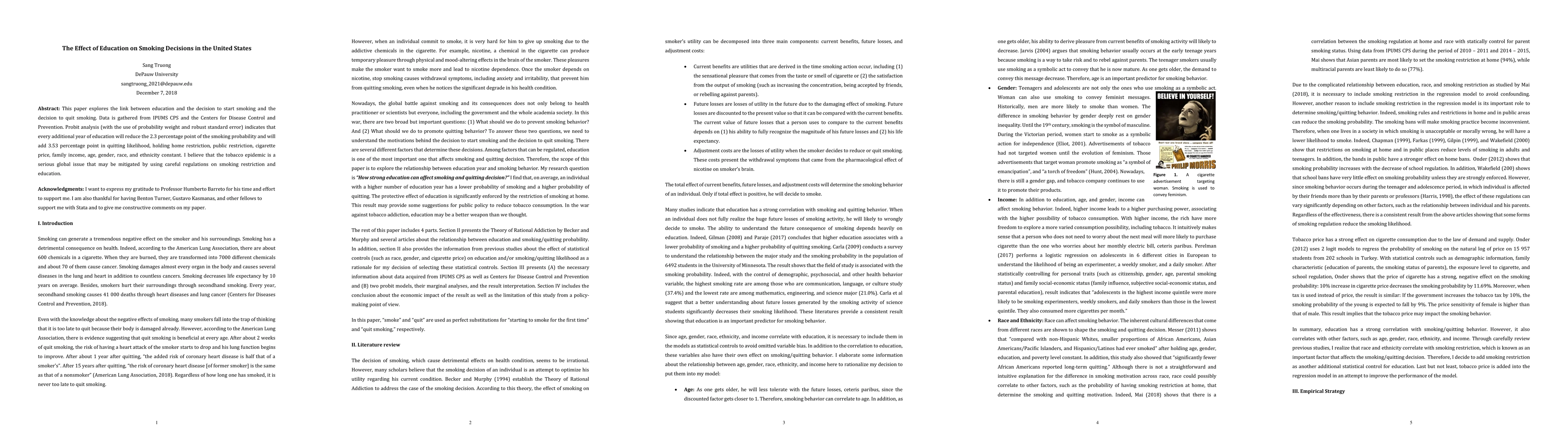 This paper finds that each additional year of education decreases the likelihood of starting smoking by 2.3 percentage points and increases the likelihood of quitting smoking by 3.53 percentage points, using data from IPUMS CPS and CDC, with statistical controls for various demographic factors. The study underscores the potential of education in mitigating the global tobacco epidemic through informed smoking decisions.
