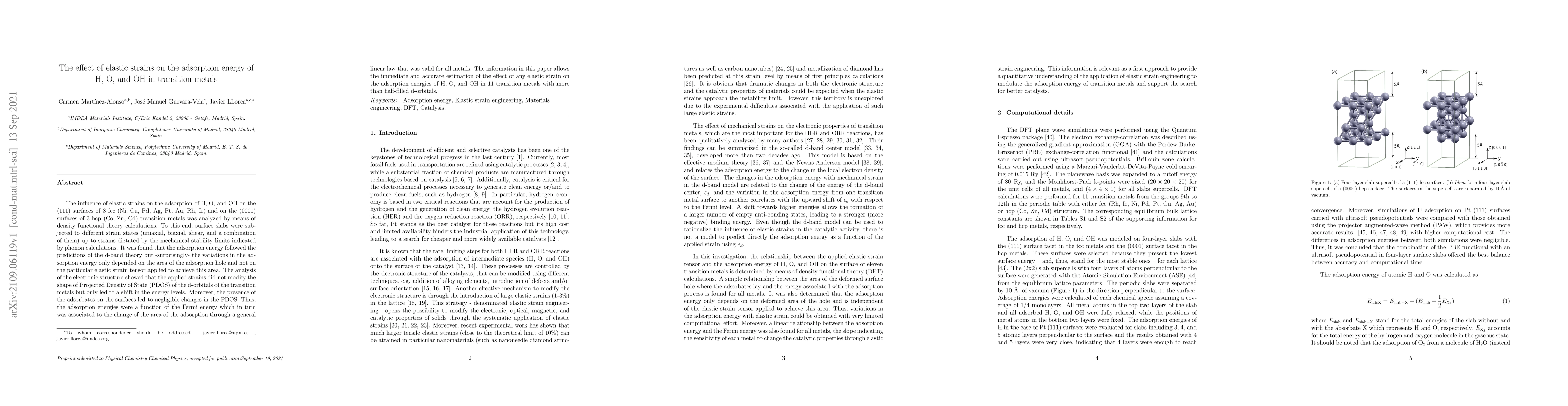 This paper investigates the effect of elastic strains on the adsorption energy of H, O, and OH on various transition metals using density functional theory. It reveals that adsorption energy variations depend on the area of the adsorption hole rather than the specific strain type, with no change in the d-orbital shape but a shift in energy levels.