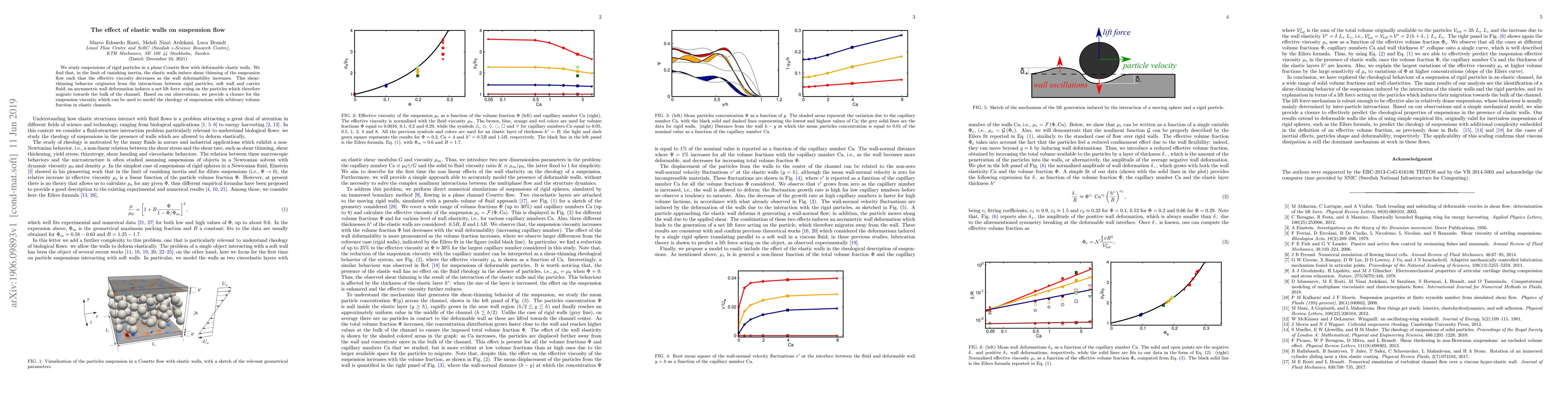 This study investigates how deformable elastic walls affect the flow of rigid particle suspensions in plane Couette flow, revealing that increased wall deformability leads to shear thinning and reduced effective viscosity. The observed behavior results from interactions between particles, walls, and fluid, prompting the development of a model for suspension viscosity in elastic channels.