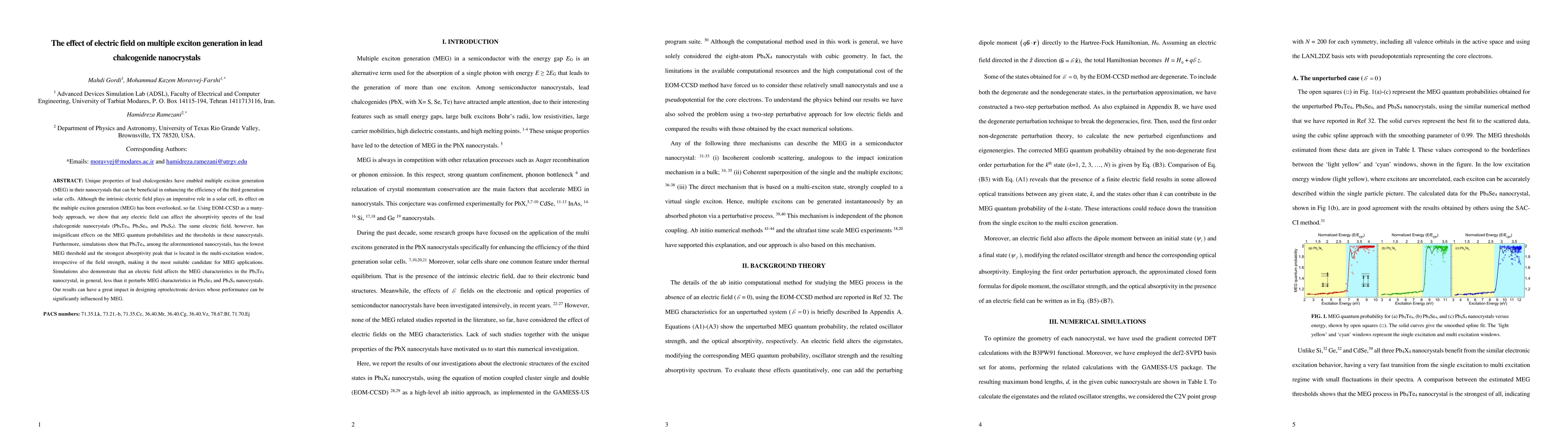 Unique properties of lead chalcogenides have enabled multiple exciton generation (MEG) in their nanocrystals that can be beneficial in enhancing the efficiency of the third generation solar cells. Although the intrinsic electric field plays an imperative role in a solar cell, its effect on the multiple exciton generation (MEG) has been overlooked, so far. Using EOM-CCSD as a many-body approach, we show that any electric field can affect the absorptivity spectra of the lead chalcogenide nanocrystals (Pb4Te4, Pb4Se4, and Pb4S4). The same electric field, however, has insignificant effects on the MEG quantum probabilities and the thresholds in these nanocrystals. Furthermore, simulations show that Pb4Te4, among the aforementioned nanocrystals, has the lowest MEG threshold and the strongest absorptivity peak that is located in the multi-excitation window, irrespective of the field strength, making it the most suitable candidate for MEG applications. Simulations also demonstrate that an electric field affects the MEG characteristics in the Pb4Te4 nanocrystal, in general, less than it perturbs MEG characteristics in Pb4Se4 and Pb4S4 nanocrystals. Our results can have a great impact in designing optoelectronic devices whose performance can be significantly influenced by MEG.