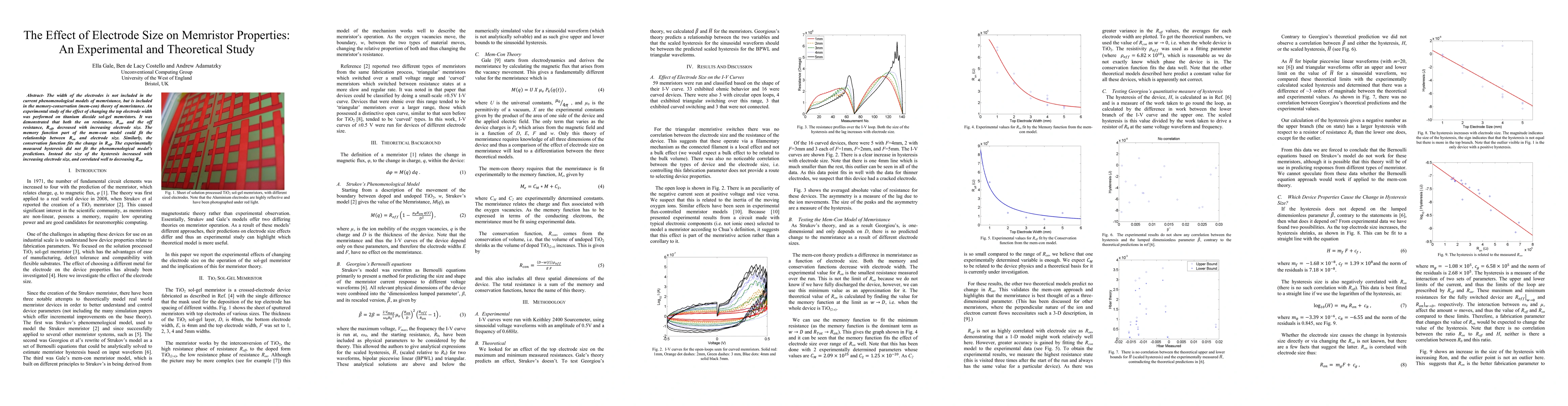 The width of the electrodes is not included in the current phenomenological models of memristance, but is included in the memory-conservation (mem-con) theory of memristance. An experimental study of the effect of changing the top electrode width was performed on titanium dioxide sol-gel memristors. It was demonstrated that both the on resistance, Ron, and the off resistance, Roff, decreased with increasing electrode size. The memory function part of the mem-con model could fit the relationship between Ron and electrode size. Similarly, the conservation function fits the change in Roff. The experimentally measured hysteresis did not fit the phenomenological model's predictions. Instead the size of the hysteresis increased with increasing electrode size, and correlated well to decreasing Ron.