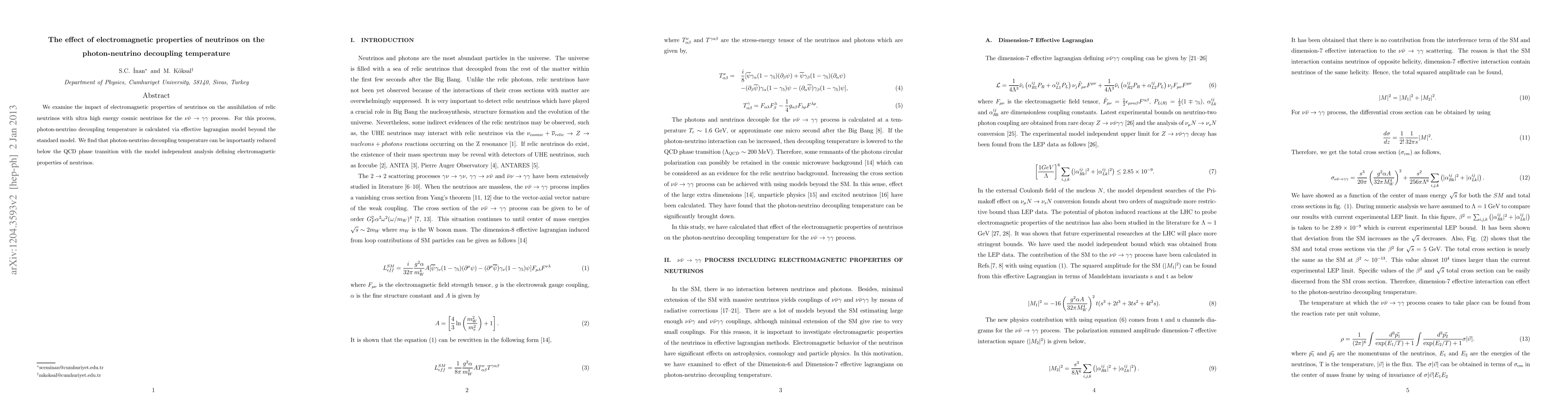 We examine the impact of electromagnetic properties of neutrinos on the annihilation of relic neutrinos with ultra high energy cosmic neutrinos for the $\nu \bar{\nu}\to \gamma\gamma$ process. For this process, photon-neutrino decoupling temperature is calculated via effective lagrangian model beyond the standard model. We find that photon-neutrino decoupling temperature can be importantly reduced below the QCD phase transition with the model independent analysis defining electromagnetic properties of neutrinos.