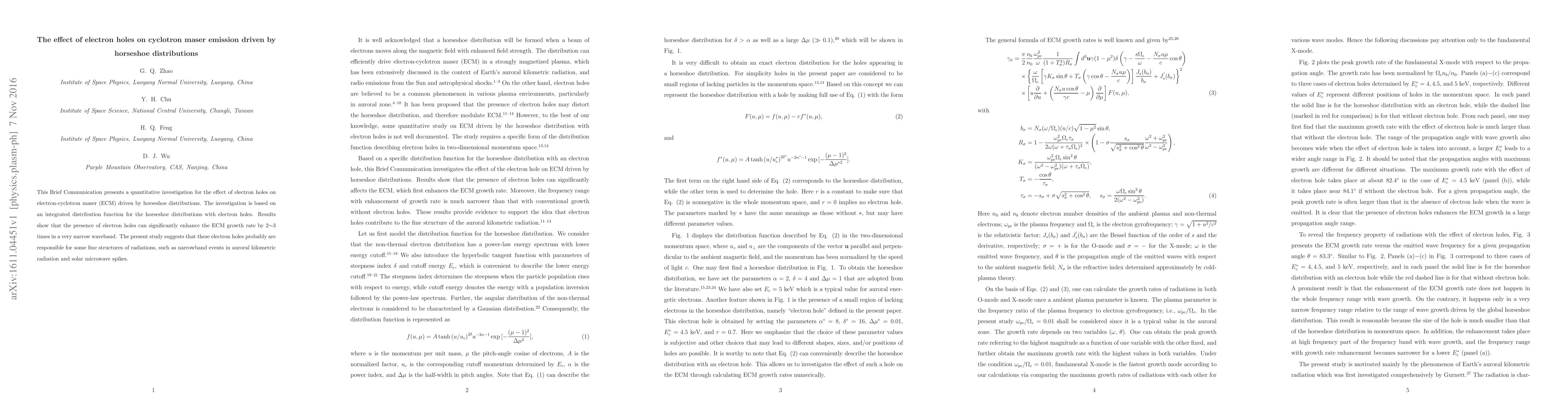 This paper investigates how electron holes in horseshoe distributions affect electron-cyclotron maser emission, finding that they can enhance the emission growth rate by 2-3 times in a narrow band. The study suggests that these electron holes may be responsible for fine structures in auroral and solar radiations.
