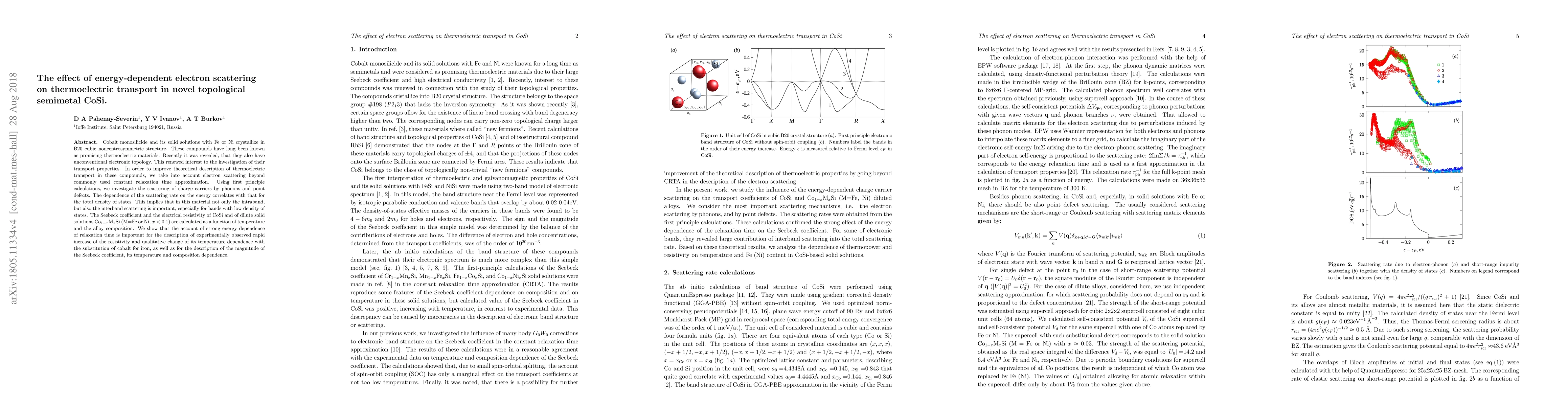 These compounds have long been known as promising thermoelectric materials. Recently it was revealed, that they also have unconventional electronic topology. This renewed interest to the investigation of their transport properties. In order to improve theoretical description of thermoelectric transport in these compounds, we take into account electron scattering beyond commonly used constant relaxation time approximation. Using first principle calculations, we investigate the scattering of charge carriers by phonons and point defects. The dependence of the scattering rate on the energy correlates with that for the total density of states. This implies that in this material not only the intraband, but also the interband scattering is important, especially for bands with low density of states. The Seebeck coefficient and the electrical resistivity of CoSi and of dilute solid solutions Co$_{1-x}$M$_x$Si (M=Fe or Ni, $x<0.1$) are calculated as a function of temperature and the alloy composition. We show that the account of strong energy dependence of relaxation time is important for the description of experimentally observed rapid increase of the resistivity and qualitative change of its temperature dependence with the substitution of cobalt for iron, as well as for the description of the magnitude of the Seebeck coefficient, its temperature and composition dependence.