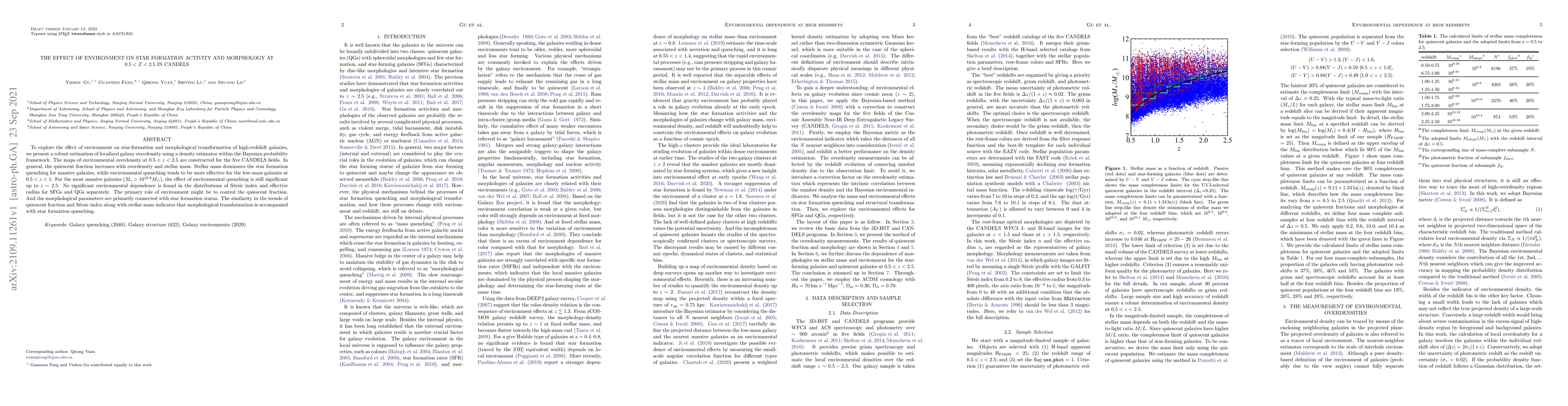 This study investigates the influence of environment on star formation and morphological changes in high-redshift galaxies ($0.5 < z < 2.5$) using CANDELS data. It finds that environmental quenching is more effective for low-mass galaxies, while stellar mass is the primary factor for quenching in massive galaxies.