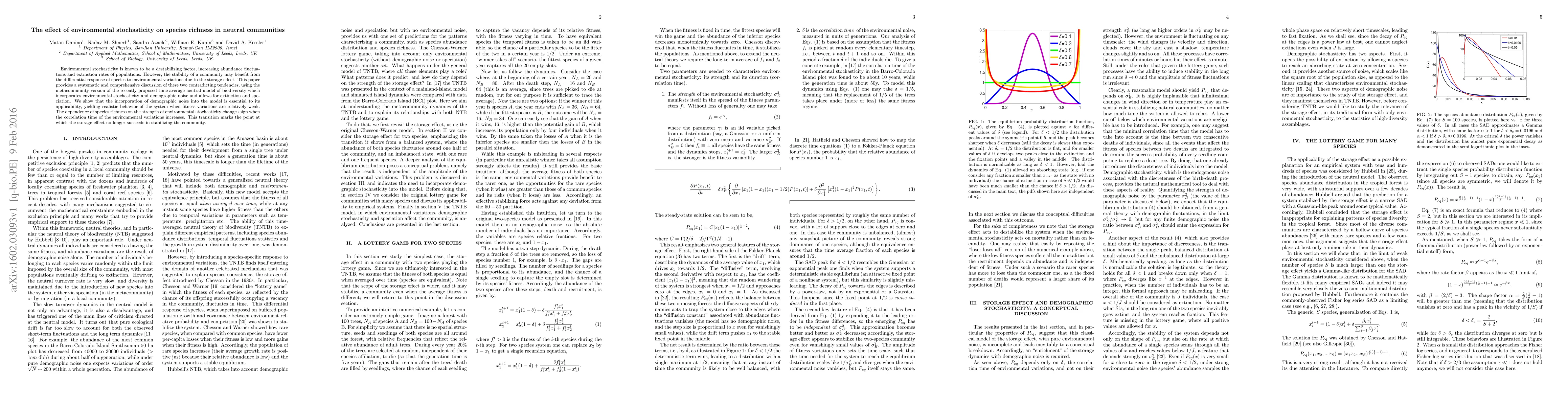 This paper examines how environmental stochasticity impacts species richness in neutral communities, revealing that while it destabilizes populations, the storage effect can stabilize communities through differential species responses. The metacommunity neutral model shows that demographic noise is crucial for realistic behavior, and species richness's dependence on environmental stochasticity changes with the correlation time of variations, marking a shift in community stability.