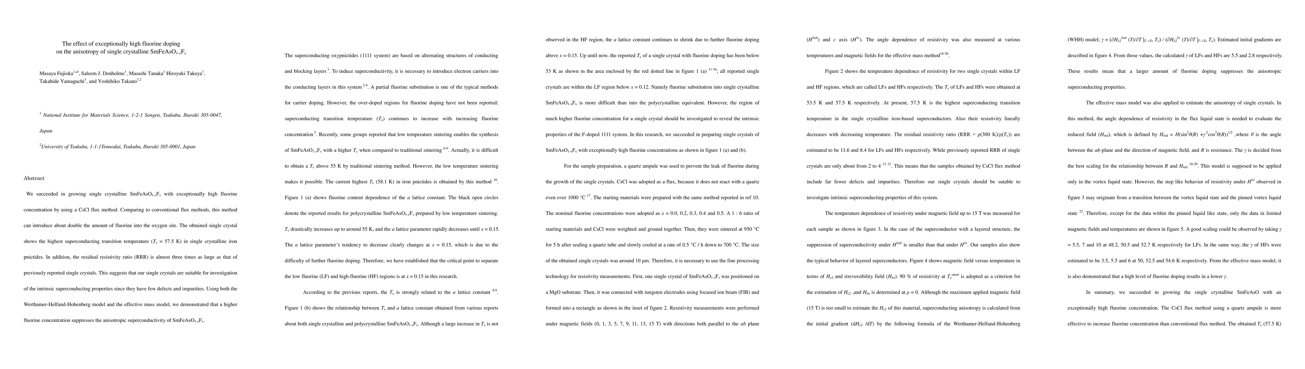 This study successfully grows single crystalline SmFeAsO1-xFx with exceptionally high fluorine doping, achieving a superconducting transition temperature of 57.5 K. The higher fluorine concentration suppresses the material's anisotropic superconductivity, as demonstrated by theoretical models.