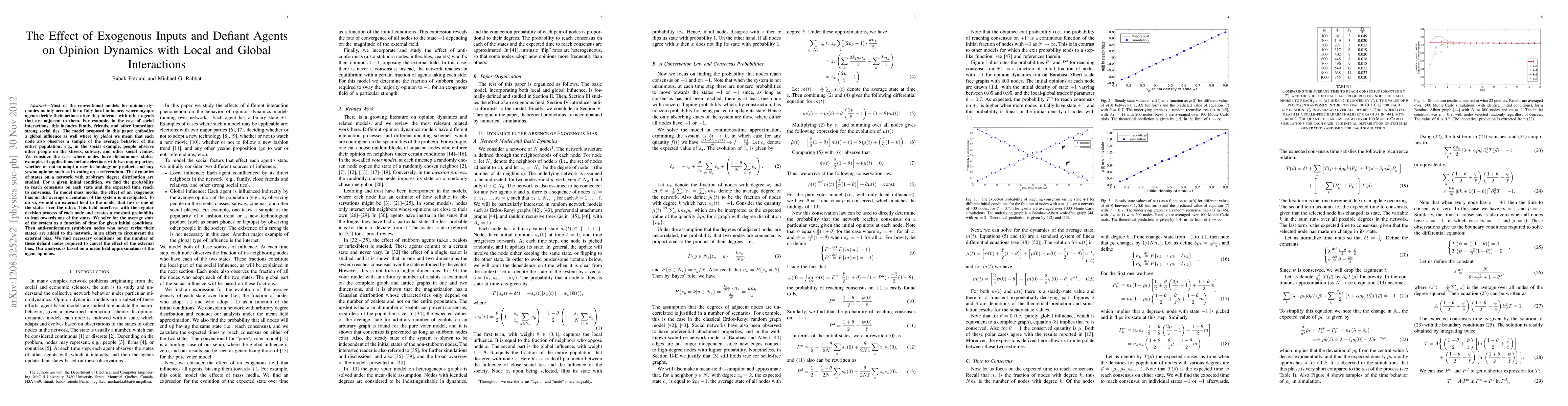Most of the conventional models for opinion dynamics mainly account for a fully local influence, where myopic agents decide their actions after they interact with other agents that are adjacent to them. For example, in the case of social interactions, this includes family, friends, and other strong social ties. The model proposed in this contribution, embodies a global influence as well where, by global, we mean that each node also observes a sample of the average behavior of the entire population (in the social example, people observe other people on the streets, subway, and other social venues). We consider a case where nodes have dichotomous states (examples include elections with two major parties, whether or not to adopt a new technology or product, and any yes/no opinion such as in voting on a referendum). The dynamics of states on a network with arbitrary degree distribution are studied. For a given initial condition, we find the probability to reach consensus on each state and the expected time reach to consensus. The effect of an exogenous bias on the average orientation of the system is investigated, to model mass media. To do so, we add an external field to the model that favors one of the states over the other. This field interferes with the regular decision process of each node and creates a constant probability to lean towards one of the states. We solve for the average state of the system as a function of time for given initial conditions. Then anti-conformists (stubborn nodes who never revise their states) are added to the network, in an effort to circumvent the external bias. We find necessary conditions on the number of these defiant nodes required to cancel the effect of the external bias. Our analysis is based on a mean field approximation of the agent opinions.