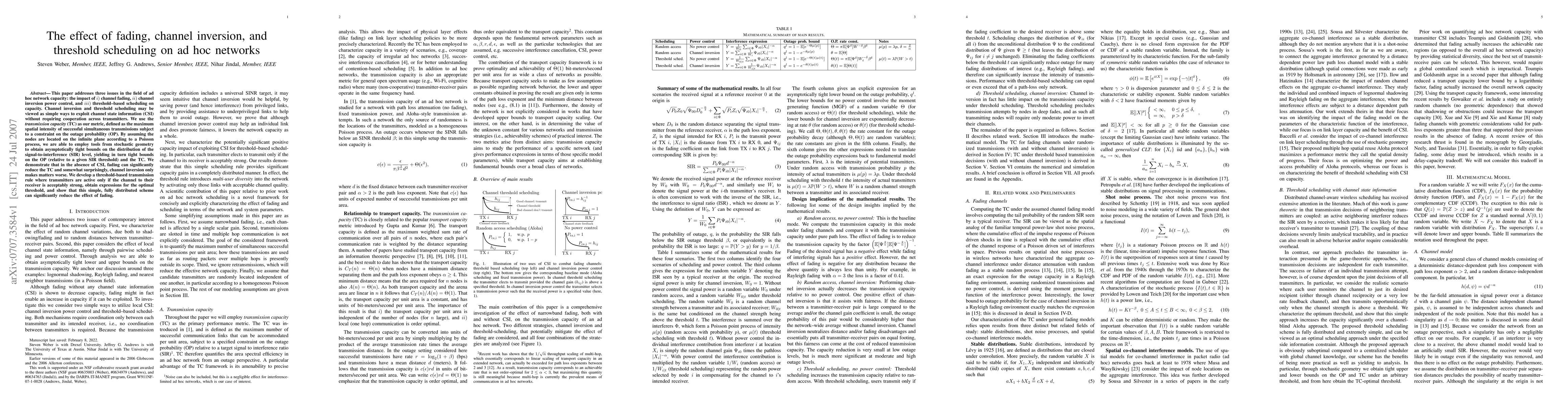 This paper investigates how channel fading, channel inversion power control, and threshold-based scheduling affect the capacity of ad hoc networks. It finds that fading can significantly reduce transmission capacity, while channel inversion can worsen the situation, but a threshold-based scheduling approach can mitigate the impact of fading effectively.