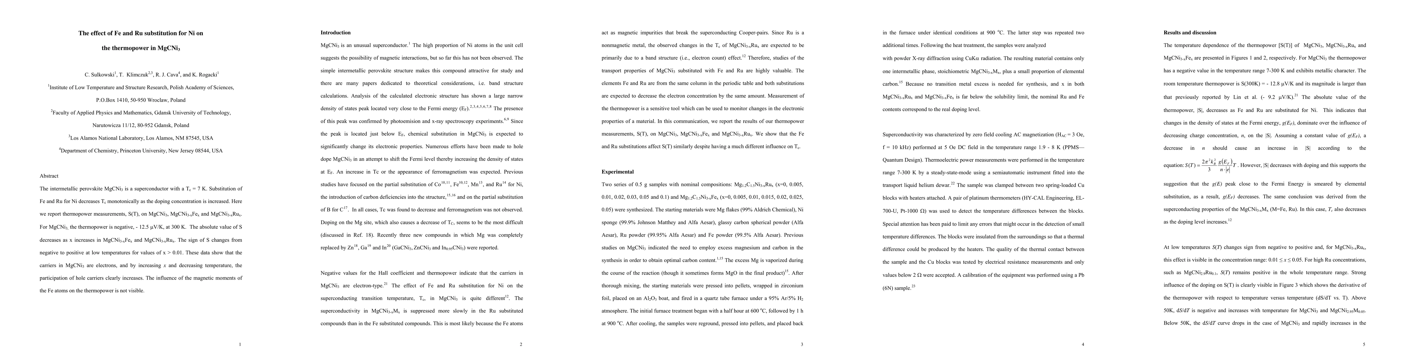 Research on MgCNi3 shows that substituting Fe and Ru for Ni decreases its superconducting temperature, with thermopower measurements revealing a change in carrier type from electrons to holes at low temperatures.