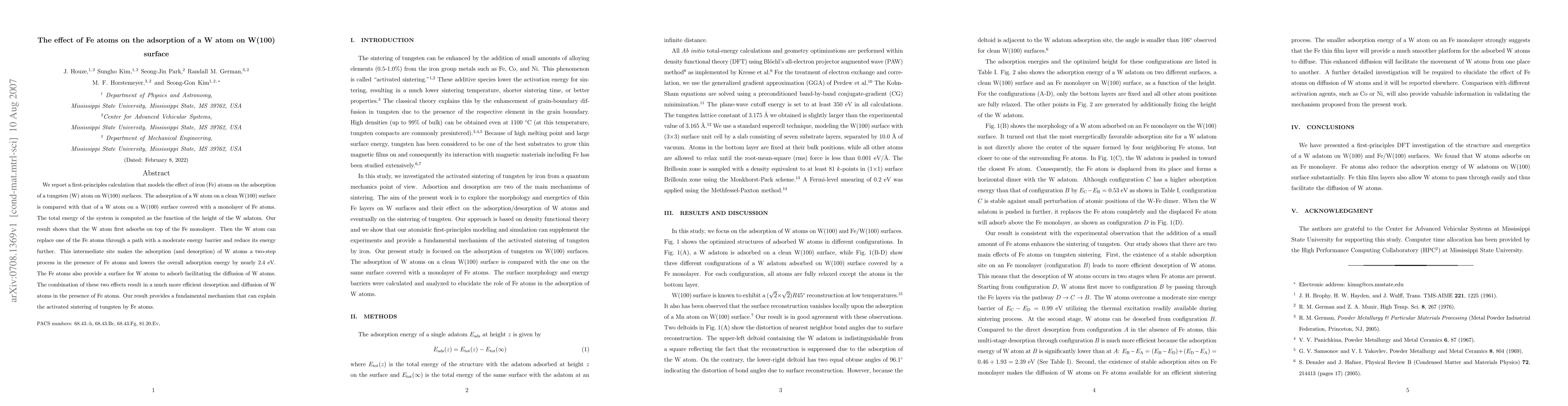 This study uses first-principles calculations to show that Fe atoms on a W(100) surface facilitate the adsorption and diffusion of W atoms, creating a two-step adsorption process and lowering the overall adsorption energy by nearly 2.4 eV, which explains the activated sintering of tungsten by Fe atoms.