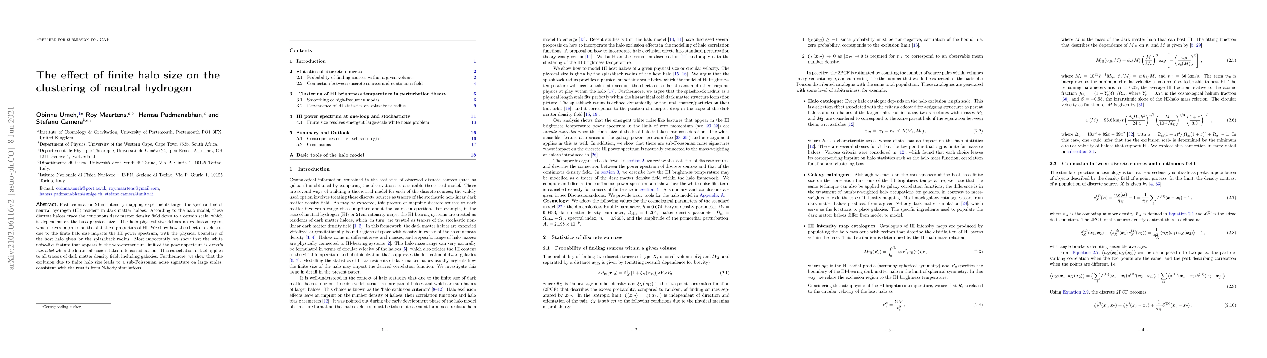 This paper investigates the impact of finite halo size on the clustering of neutral hydrogen (HI) using the halo model. It demonstrates that the finite halo size, defined by the splashback radius, cancels the white noise feature in the HI power spectrum, affecting all dark matter density tracers, and introduces sub-Poissonian noise on large scales, corroborated by N-body simulations.