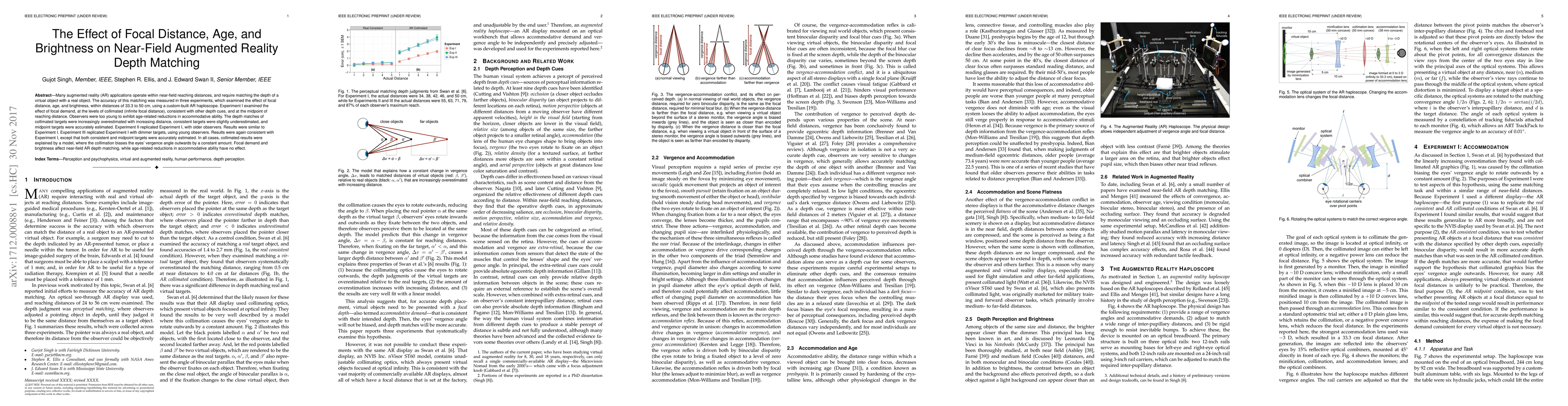 Many augmented reality (AR) applications operate within near-field reaching distances, and require matching the depth of a virtual object with a real object. The accuracy of this matching was measured in three experiments, which examined the effect of focal distance, age, and brightness, within distances of 33.3 to 50 cm, using a custom-built AR haploscope. Experiment I examined the effect of focal demand, at the levels of collimated (infinite focal distance), consistent with other depth cues, and at the midpoint of reaching distance. Observers were too young to exhibit age-related reductions in accommodative ability. The depth matches of collimated targets were increasingly overestimated with increasing distance, consistent targets were slightly underestimated, and midpoint targets were accurately estimated. Experiment II replicated Experiment I, with older observers. Results were similar to Experiment I. Experiment III replicated Experiment I with dimmer targets, using young observers. Results were again consistent with Experiment I, except that both consistent and midpoint targets were accurately estimated. In all cases, collimated results were explained by a model, where the collimation biases the eyes' vergence angle outwards by a constant amount. Focal demand and brightness affect near-field AR depth matching, while age-related reductions in accommodative ability have no effect.