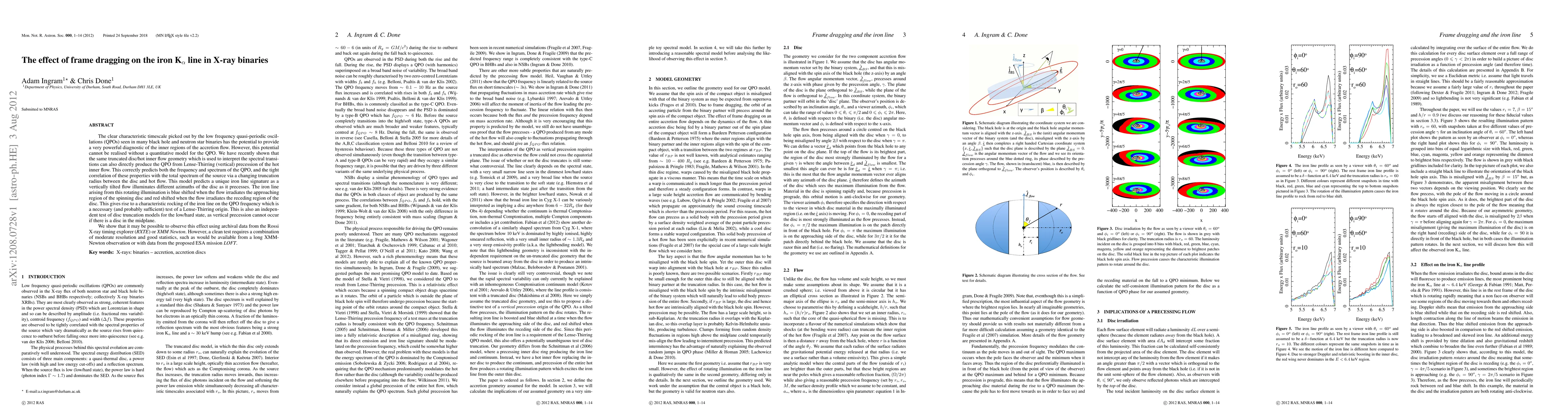 The clear characteristic timescale picked out by the low frequency quasi-periodic oscillations (QPOs) seen in many black hole and neutron star binaries has the potential to provide a very powerful diagnostic of the inner regions of the accretion flow. However, this potential cannot be realised without a quantitative model for the QPO. We have recently shown that the same truncated disc/hot inner flow geometry which is used to interpret the spectral transitions can also directly produce the QPO from Lense-Thirring (vertical) precession of the hot inner flow. This correctly predicts both the frequency and spectrum of the QPO, and the tight correlation of these properties with the total spectrum of the source via a changing truncation radius between the disc and hot flow. This model predicts a unique iron line signature as a vertically tilted flow illuminates different azimuths of the disc as it precesses. The iron line arising from this rotating illumination is blue shifted when the flow irradiates the approaching region of the spinning disc and red shifted when the flow irradiates the receding region of the disc. This gives rise to a characteristic rocking of the iron line on the QPO frequency which is a necessary (and probably sufficient) test of a Lense-Thirring origin. This is also an independent test of disc truncation models for the low/hard state, as vertical precession cannot occur if there is a disc in the midplane. We show that it may be possible to observe this effect using archival data from the Rossi X-ray timing explorer (RXTE) or XMM Newton. However, a clean test requires a combination of moderate resolution and good statistics, such as would be available from a long XMM-Newton observation or with data from the proposed ESA mission LOFT.