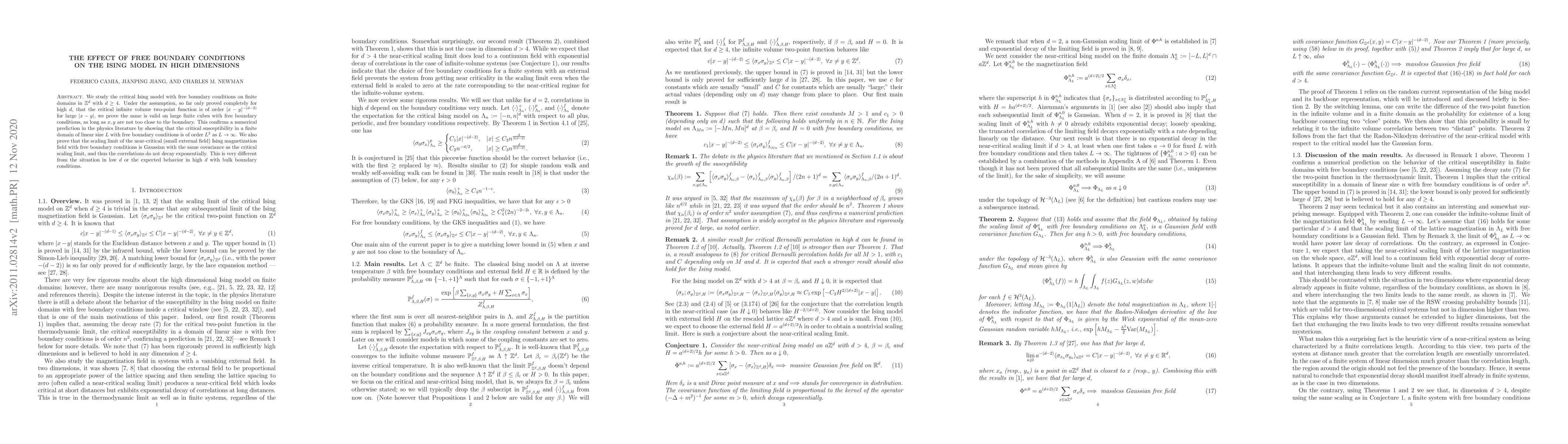 This paper proves the critical two-point function in high-dimensional Ising models with free boundary conditions behaves as $|x-y|^{-(d-2)}$ for large distances, confirming numerical predictions. It also shows that the critical susceptibility scales as $L^2$ for large finite domains, and the near-critical magnetization field is Gaussian, differing from low dimensions and bulk boundary conditions.