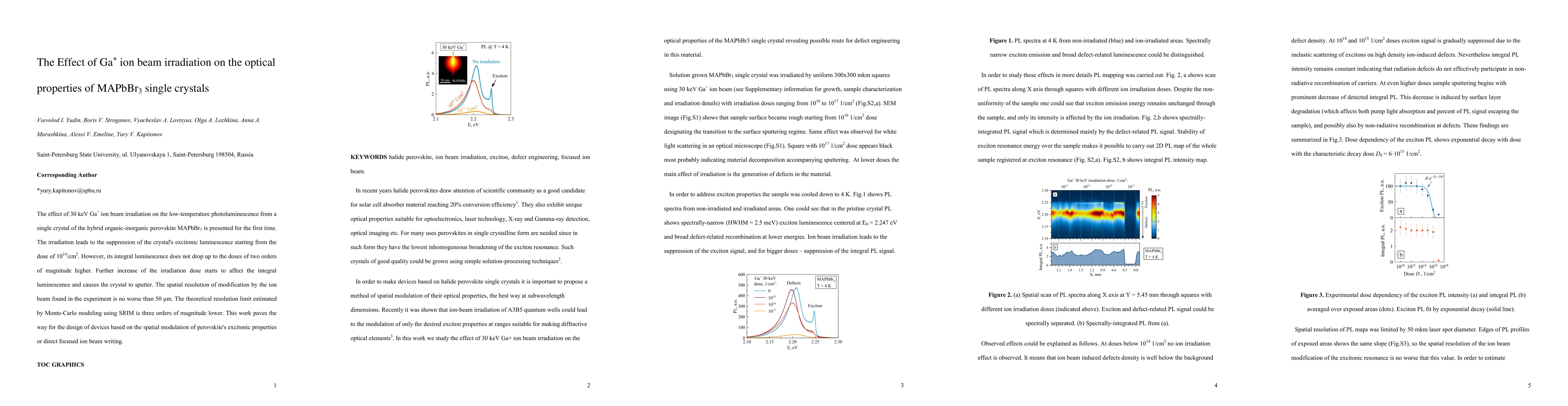 Researchers found that Ga+ ion beam irradiation suppresses excitonic luminescence in MAPbBr3 single crystals at doses as low as 10^14/cm2, but integral luminescence remains unaffected until higher doses.