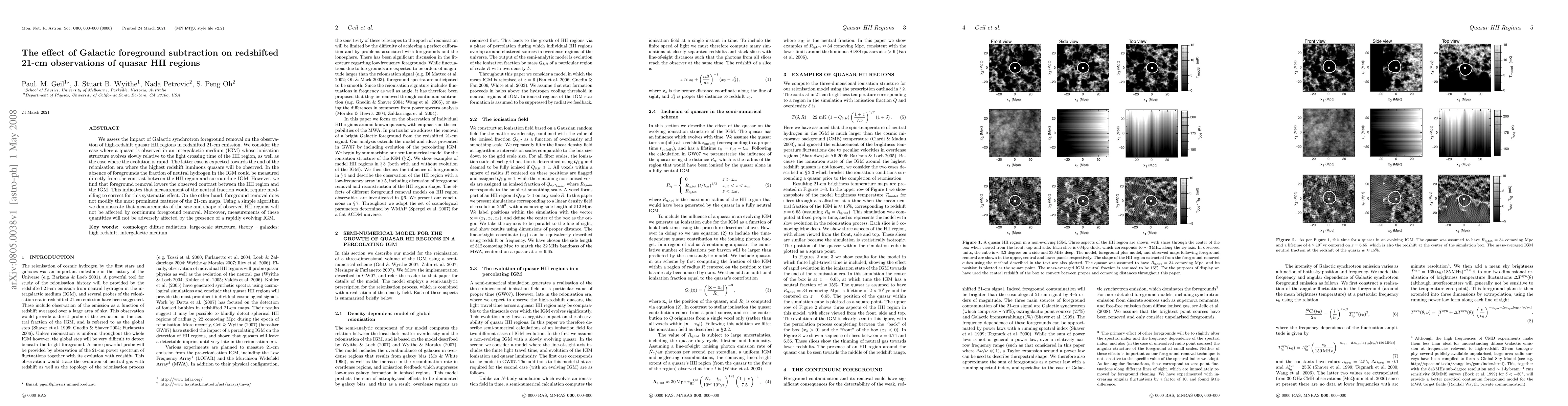 This paper evaluates the impact of Galactic synchrotron foreground removal on the observation of high-redshift quasar HII regions in redshifted 21-cm emission, finding that while foreground removal reduces the contrast between HII regions and the IGM, it does not affect measurements of HII region size and shape. The study also concludes that rapid evolution of the IGM does not adversely impact these measurements.