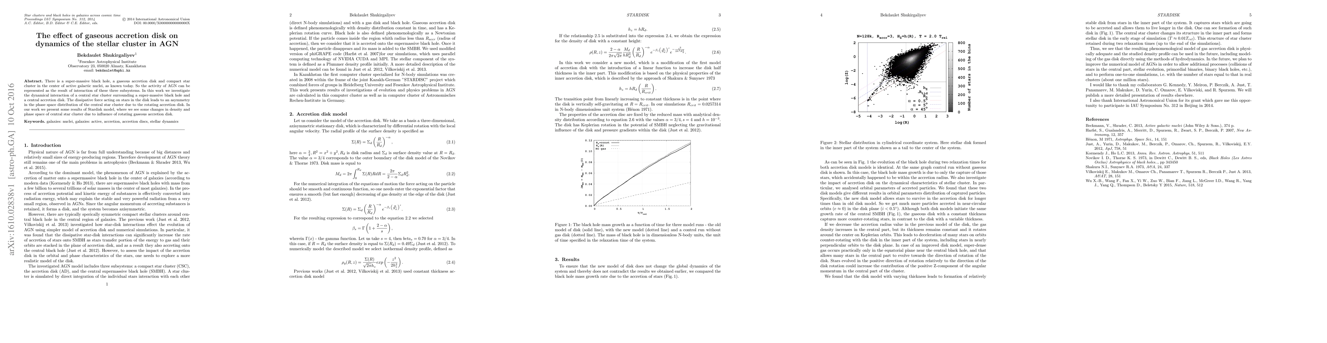 There is a supermassive black hole, a gaseous accretion disk and compact star cluster in the center of active galactic nuclei, as known today. So the activity of AGN can be represented as the result of interaction of these three subsystems. In this work we investigate the dynamical interaction of a central star cluster surrounding a supermassive black hole and a central accretion disk. The dissipative force acting on stars in the disk leads to an asymmetry in the phase space distribution of the central star cluster due to the rotating accretion disk. In our work we present some results of Stardisk model, where we see some changes in density and phase space of central star cluster due to influence of rotating gaseous accretion disk.