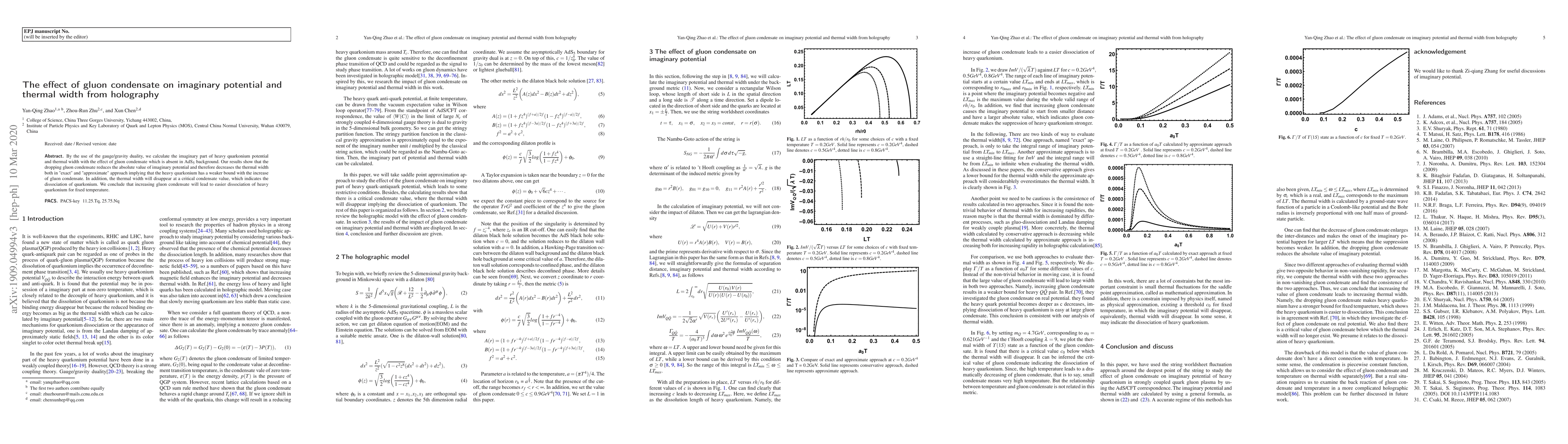 Title: The effect of gluon condensate on imaginary potential and thermal width from holography Summary: Using gauge/gravity duality, we find that a reduced gluon condensate decreases the imaginary part of the heavy quarkonium potential and thermal width, indicating weaker binding and easier dissociation of quarkonium at higher gluon condensate levels.