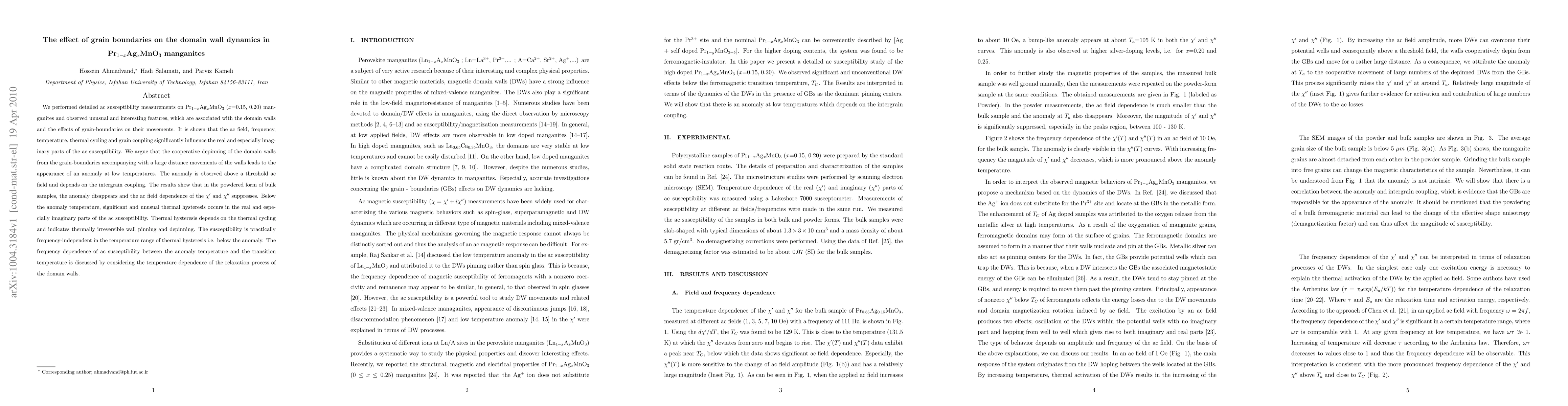 We performed detailed ac susceptibility measurements on Pr$_{1-x}$Ag$_x$MnO$_3$ ($x$=0.15, 0.20) manganites and observed unusual and interesting features, which are associated with the domain walls and the effects of grain-boundaries on their movements. It is shown that the ac field, frequency, temperature, thermal cycling and grain coupling significantly influence the real and especially imaginary parts of the ac susceptibility. We argue that the cooperative depinning of the domain walls from the grain-boundaries accompanying with a large distance movements of the walls leads to the appearance of an anomaly at low temperatures. The anomaly is observed above a threshold ac field and depends on the intergrain coupling. The results show that in the powdered form of bulk samples, the anomaly disappears and the ac field dependence of the $\chi'$ and $\chi"$ suppresses. Below the anomaly temperature, significant and unusual thermal hysteresis occurs in the real and especially imaginary parts of the ac susceptibility. Thermal hysteresis depends on the thermal cycling and indicates thermally irreversible wall pinning and depinning. The susceptibility is practically frequency-independent in the temperature range of thermal hysteresis i.e. below the anomaly. The frequency dependence of ac susceptibility between the anomaly temperature and the transition temperature is discussed by considering the temperature dependence of the relaxation process of the domain walls.