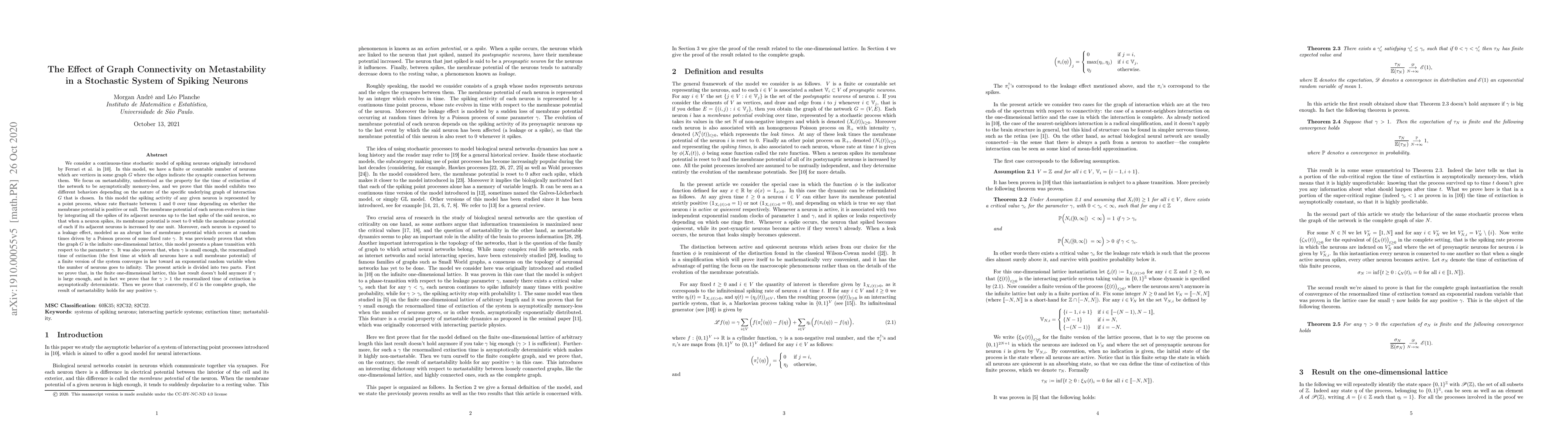 This paper investigates the impact of graph connectivity on the metastability of a stochastic system of spiking neurons. It demonstrates that the model's behavior changes depending on the underlying graph, showing deterministic extinction for finite lattices when the leakage parameter exceeds 1, and metastability for complete graphs regardless of the parameter value.