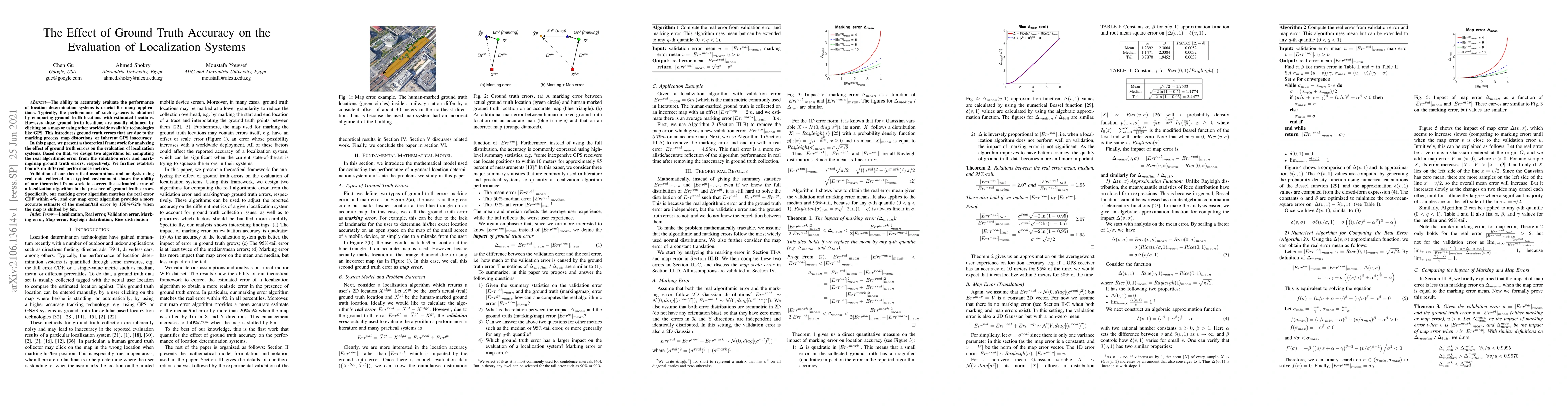 The ability to accurately evaluate the performance of location determination systems is crucial for many applications. Typically, the performance of such systems is obtained by comparing ground truth locations with estimated locations. However, these ground truth locations are usually obtained by clicking on a map or using other worldwide available technologies like GPS. This introduces ground truth errors that are due to the marking process, map distortions, or inherent GPS inaccuracy. In this paper, we present a theoretical framework for analyzing the effect of ground truth errors on the evaluation of localization systems. Based on that, we design two algorithms for computing the real algorithmic error from the validation error and marking/map ground truth errors, respectively. We further establish bounds on different performance metrics. Validation of our theoretical assumptions and analysis using real data collected in a typical environment shows the ability of our theoretical framework to correct the estimated error of a localization algorithm in the presence of ground truth errors. Specifically, our marking error algorithm matches the real error CDF within 4%, and our map error algorithm provides a more accurate estimate of the median/tail error by 150%/72% when the map is shifted by 6m.