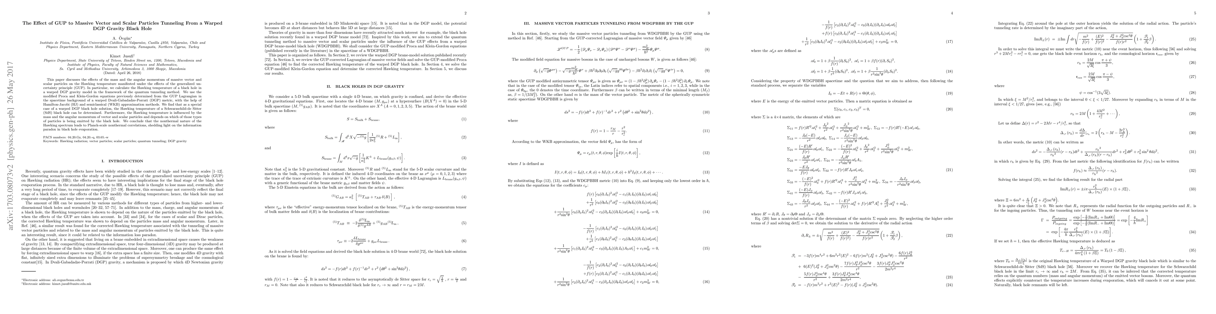 The paper presents a detailed calculation of Hawking temperature for a warped DGP gravity black hole, incorporating the GUP and considering massive vector and scalar particles, using advanced approximation methods.