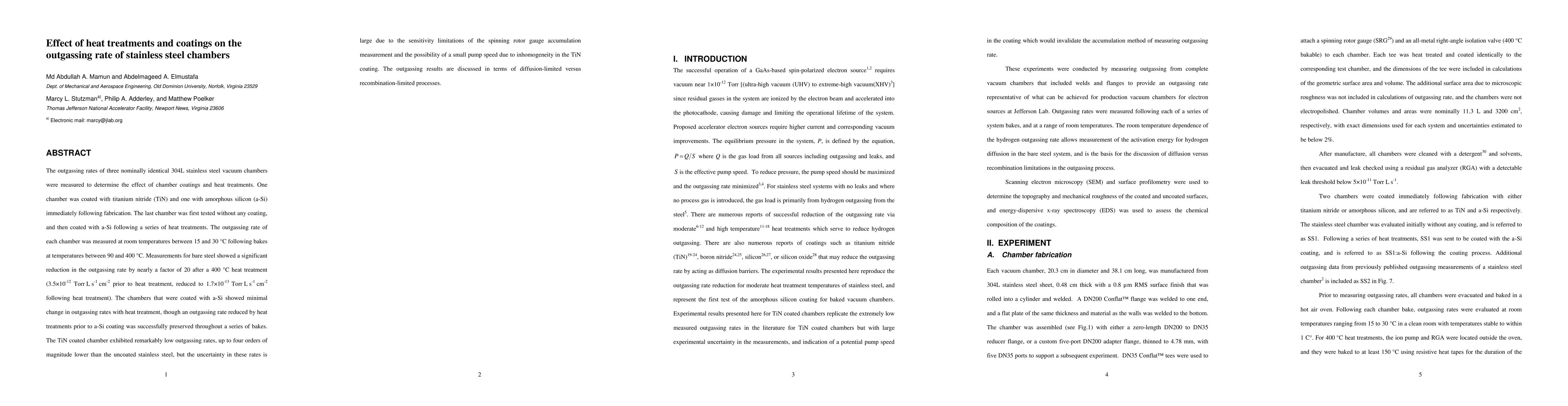 This study investigates the impact of coatings and heat treatments on the outgassing rates of 304L stainless steel vacuum chambers. Heat treatment significantly reduced the outgassing rate of uncoated steel, while titanium nitride and amorphous silicon coatings resulted in much lower outgassing rates, with TiN showing the most effective reduction, though with high measurement uncertainties.