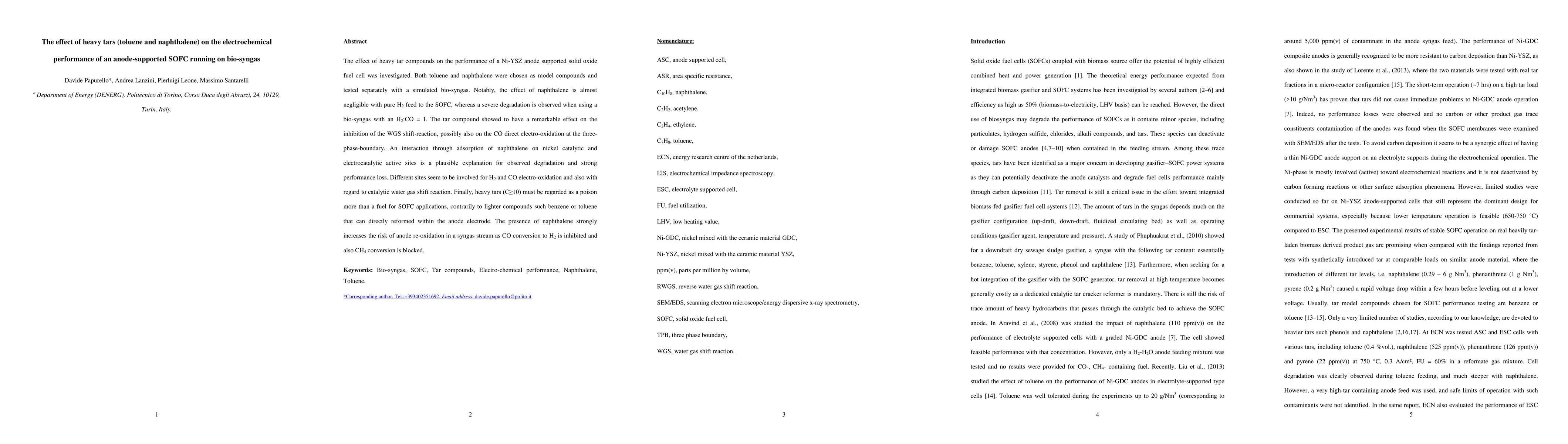 This paper investigates the impact of heavy tar compounds, toluene and naphthalene, on the electrochemical performance of a Ni-YSZ anode-supported solid oxide fuel cell (SOFC) operating on bio-syngas. Naphthalene causes severe degradation in performance when used with bio-syngas, inhibiting the water gas shift reaction and CO direct electro-oxidation, while toluene has a negligible effect.