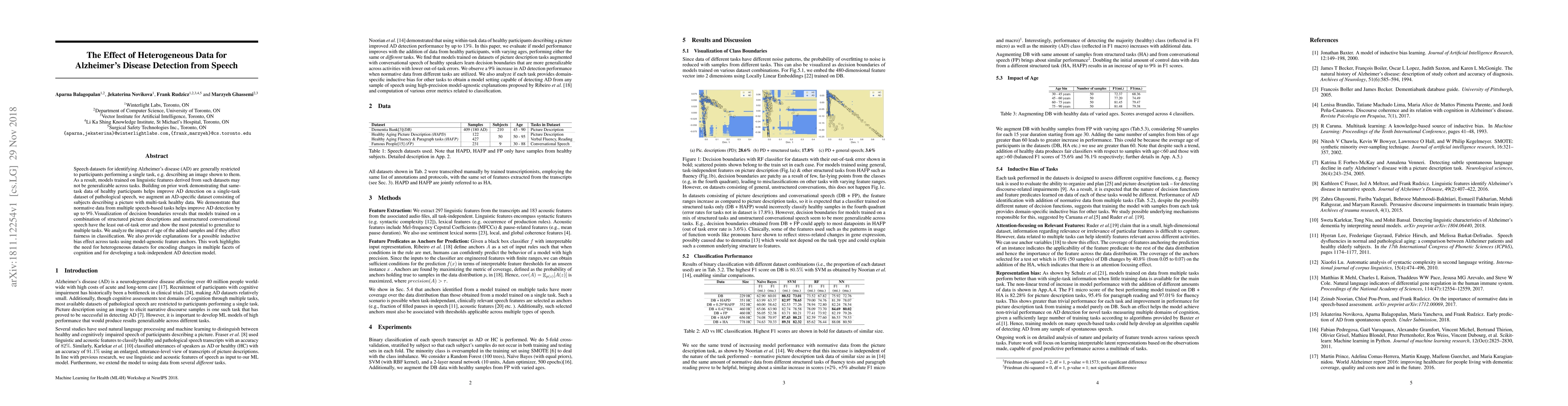 Speech datasets for identifying Alzheimer's disease (AD) are generally restricted to participants performing a single task, e.g. describing an image shown to them. As a result, models trained on linguistic features derived from such datasets may not be generalizable across tasks. Building on prior work demonstrating that same-task data of healthy participants helps improve AD detection on a single-task dataset of pathological speech, we augment an AD-specific dataset consisting of subjects describing a picture with multi-task healthy data. We demonstrate that normative data from multiple speech-based tasks helps improve AD detection by up to 9%. Visualization of decision boundaries reveals that models trained on a combination of structured picture descriptions and unstructured conversational speech have the least out-of-task error and show the most potential to generalize to multiple tasks. We analyze the impact of age of the added samples and if they affect fairness in classification. We also provide explanations for a possible inductive bias effect across tasks using model-agnostic feature anchors. This work highlights the need for heterogeneous datasets for encoding changes in multiple facets of cognition and for developing a task-independent AD detection model.