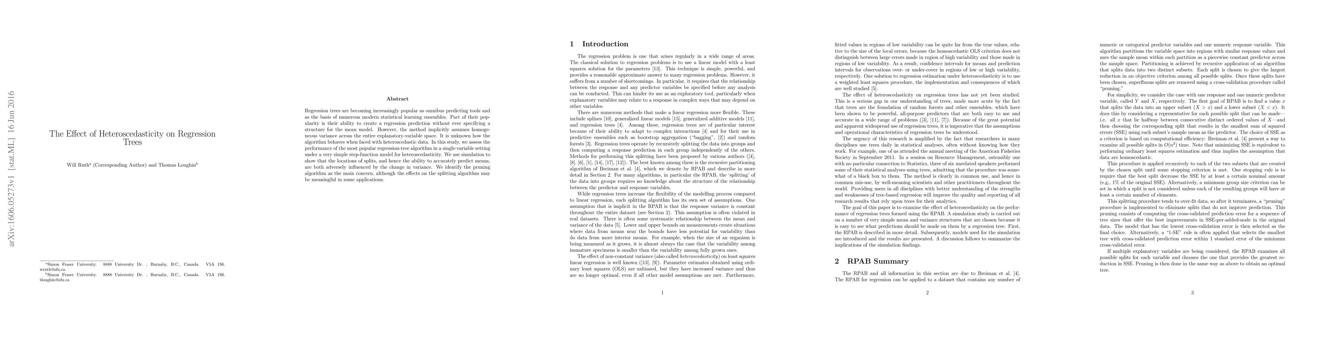 This study investigates how heteroscedasticity affects the performance of regression trees, finding that changes in variance can adversely influence split locations and prediction accuracy. The pruning algorithm is identified as particularly vulnerable, though the splitting algorithm may also be affected in certain contexts.
