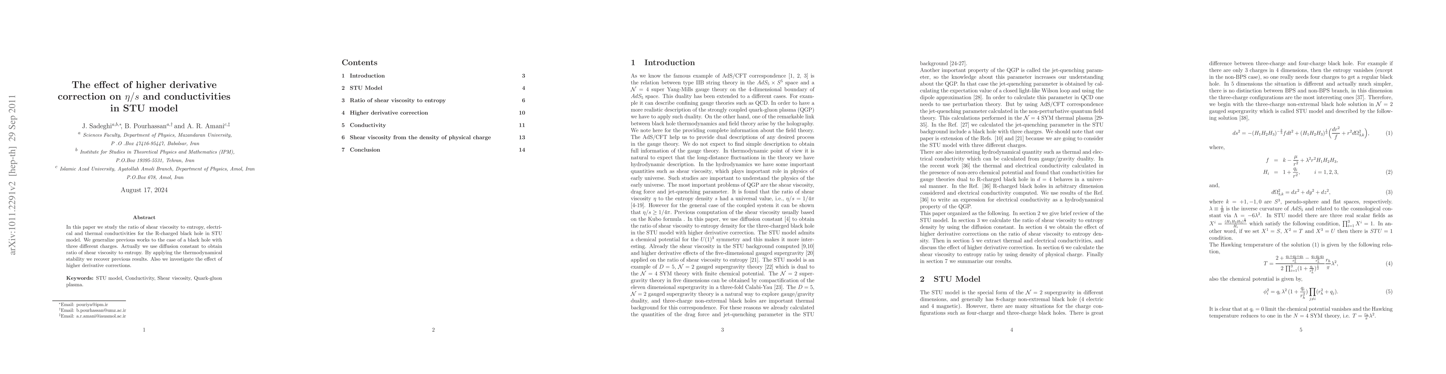 This paper examines the ratio of shear viscosity to entropy and various conductivities in the STU model for an R-charged black hole with three charges, using higher derivative corrections. It confirms previous results through thermodynamical stability and explores the impact of these corrections.