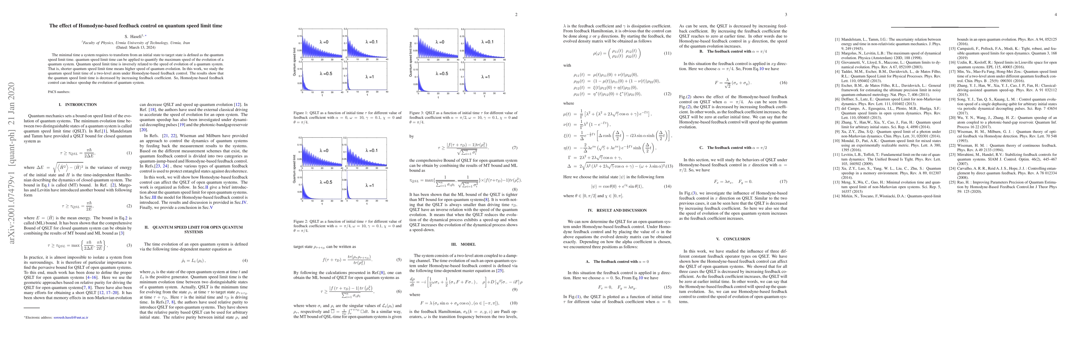 This paper investigates how Homodyne-based feedback control affects the quantum speed limit time of a two-level atom, demonstrating that increased feedback coefficients can decrease the quantum speed limit time, thereby speeding up the quantum evolution process.