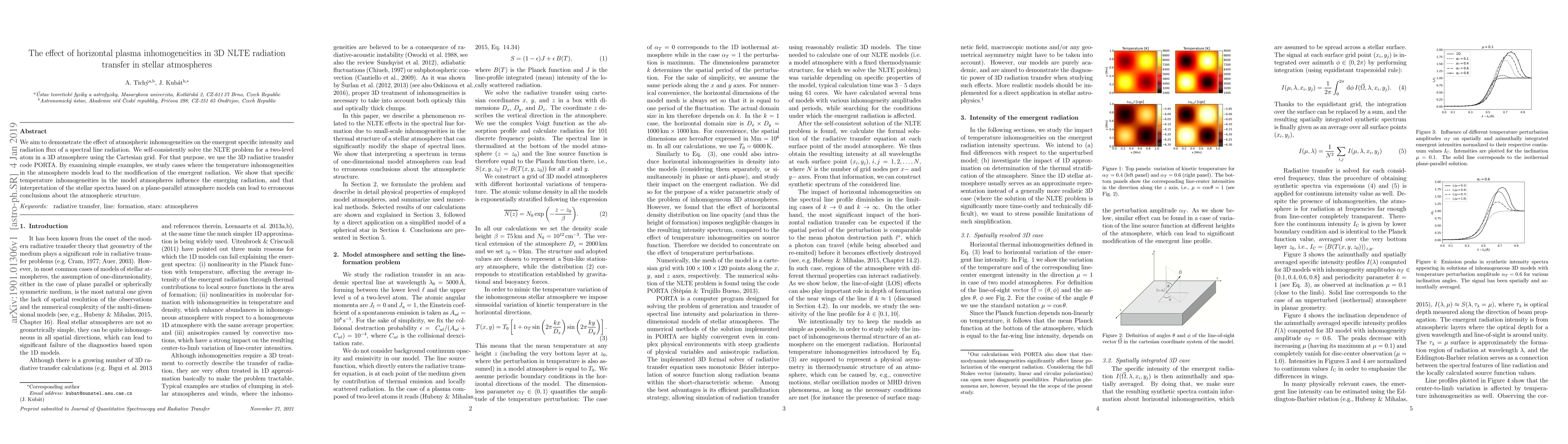 This paper investigates how horizontal plasma inhomogeneities in 3D non-local thermodynamic equilibrium (NLTE) radiation transfer affect the emergent specific intensity and radiation flux in stellar atmospheres. Using the PORTA code, the authors demonstrate that temperature inhomogeneities can significantly alter the emerging radiation, highlighting the need for more complex atmospheric models to avoid misinterpretation of stellar spectra.