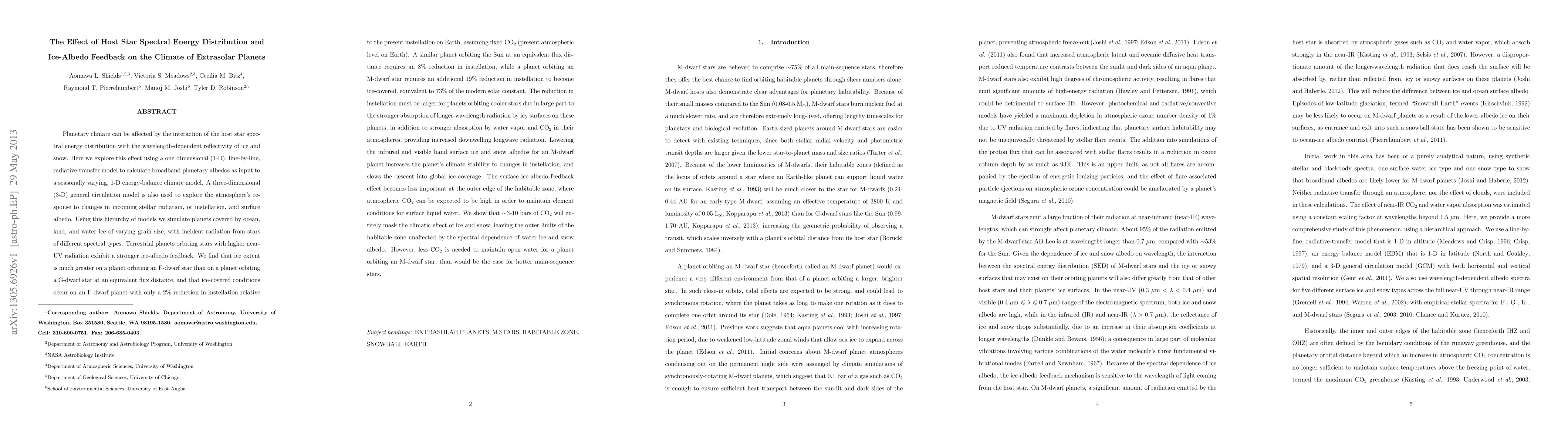 This paper explores how the spectral energy distribution of a host star and ice-albedo feedback influence the climate of extrasolar planets using various climate models. It finds that planets orbiting stars with higher near-UV radiation require significant reductions in instellation to become ice-covered, while higher CO2 levels can mask the ice-albedo effect, especially in the outer habitable zone.