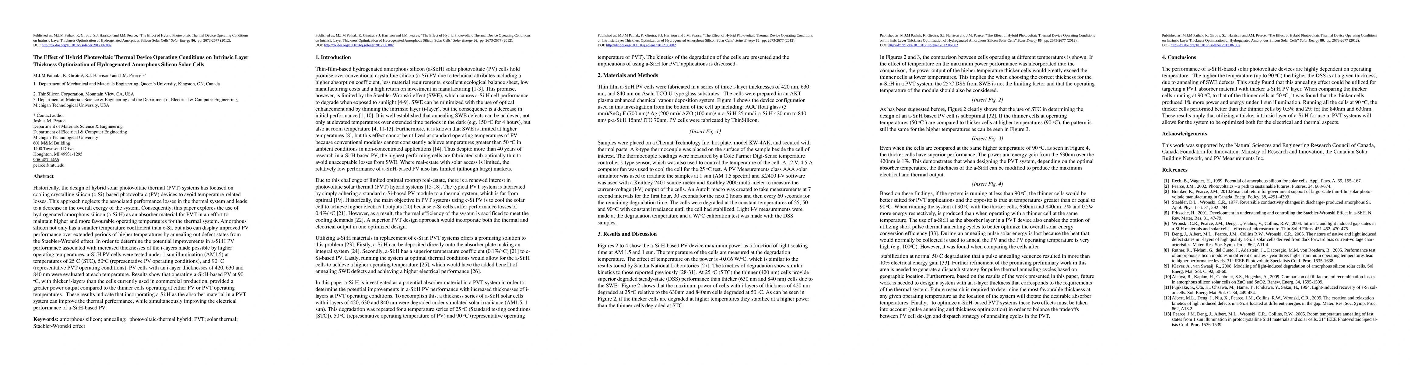 Historically, the design of hybrid solar photovoltaic thermal (PVT) systems has focused on cooling crystalline silicon (c-Si)-based photovoltaic (PV) devices to avoid temperature-related losses. This approach neglects the associated performance losses in the thermal system and leads to a decrease in the overall exergy of the system. Consequently, this paper explores the use of hydrogenated amorphous silicon (a-Si:H) as an absorber material for PVT in an effort to maintain higher and more favourable operating temperatures for the thermal system. Amorphous silicon not only has a smaller temperature coefficient than c-Si, but also can display improved PV performance over extended periods of higher temperatures by annealing out defect states from the Staebler-Wronski effect. In order to determine the potential improvements in a-Si:H PV performance associated with increased thicknesses of the i-layers made possible by higher operating temperatures, a-Si:H PV cells were tested under 1 sun illumination (AM1.5) at temperatures of 25oC (STC), 50oC (representative PV operating conditions), and 90 oC (representative PVT operating conditions). PV cells with an i-layer thicknesses of 420, 630 and 840 nm were evaluated at each temperature. Results show that operating a-Si:H-based PV at 90 oC, with thicker i-layers than the cells currently used in commercial production, provided a greater power output compared to the thinner cells operating at either PV or PVT operating temperatures. These results indicate that incorporating a-Si:H as the absorber material in a PVT system can improve the thermal performance, while simultaneously improving the electrical performance of a-Si:H-based PV.