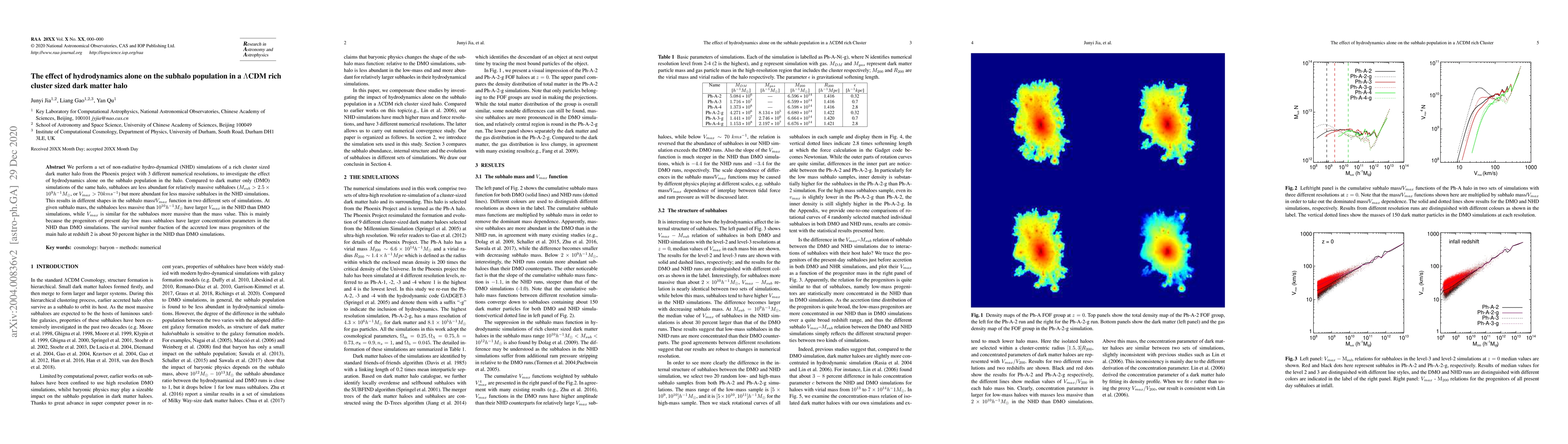 We perform a set of non-radiative hydro-dynamical (NHD) simulations of a rich cluster sized dark matter halo from the Phoenix project with 3 different numerical resolutions, to investigate the effect of hydrodynamics alone on the subhalo population in the halo. Compared to dark matter only (DMO) simulations of the same halo, subhaloes are less abundant for relatively massive subhaloes ($M_{sub} > 2.5 \times 10^9h^{-1}M_{\odot}$, or $V_{max} > 70 kms^{-1}$) but more abundant for less massive subhaloes in the NHD simulations. This results in different shapes in the subhalo mass/$V_{max}$ function in two different sets of simulations. At given subhalo mass, the subhaloes less massive than $10^{10} h^{-1}M_{\odot}$ have larger $V_{max}$ in the NHD than DMO simulations, while $V_{max}$ is similar for the subhaloes more massive than the mass value. This is mainly because the progenitors of present day low mass subhaloes have larger concentration parameters in the NHD than DMO simulations. The survival number fraction of the accreted low mass progenitors of the main halo at redshift 2 is about 50 percent higher in the NHD than DMO simulations.