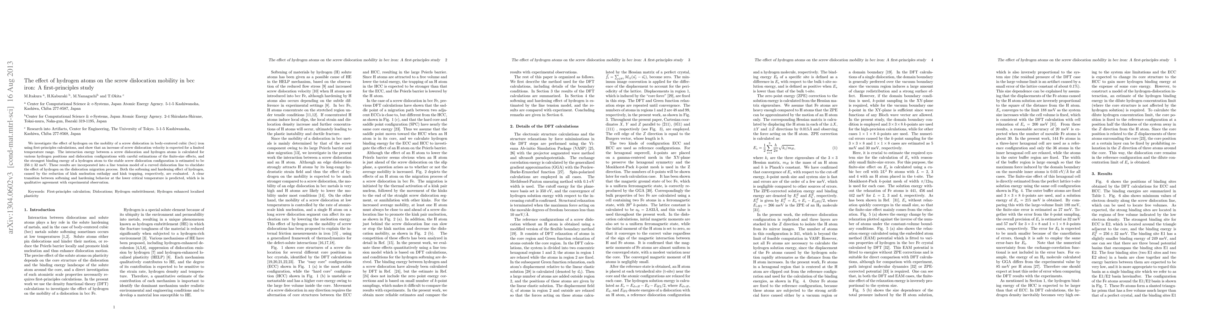 This study uses first-principles calculations to explore how hydrogen affects the mobility of screw dislocations in bcc iron, finding an increased dislocation velocity within a specific temperature range. The strongest binding energy for hydrogen to the stable screw dislocation is estimated to be $256\pm32$ meV, and the transition between softening and hardening behaviors due to hydrogen is predicted at a lower critical temperature.