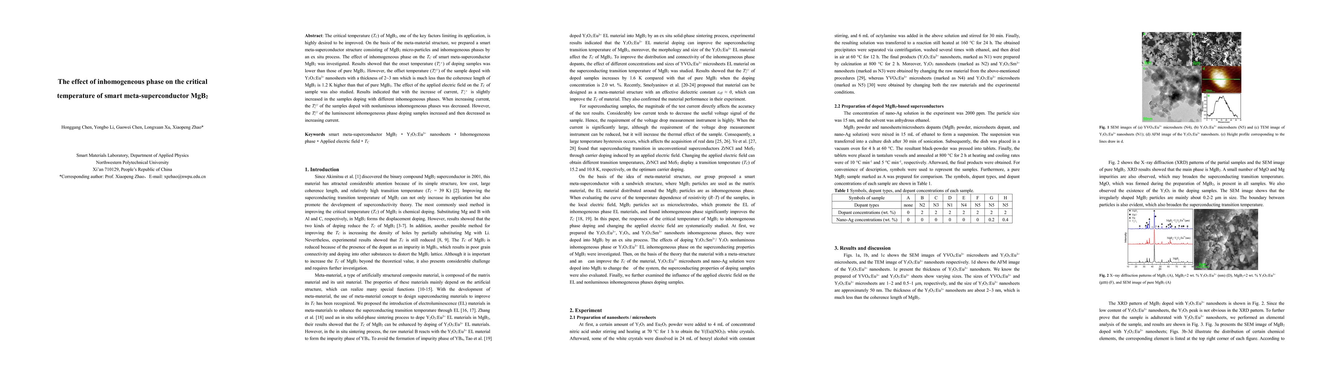 The critical temperature (TC) of MgB2, one of the key factors limiting its application, is highly desired to be improved. On the basis of the meta-material structure, we prepared a smart meta-superconductor structure consisting of MgB2 micro-particles and inhomogeneous phases by an ex situ process. The effect of inhomogeneous phase on the TC of smart meta-superconductor MgB2 was investigated. Results showed that the onset temperature (Ton C) of doping samples was lower than those of pure MgB2. However, the offset temperature (Toff C) of the sample doped with Y2O3:Eu3+ nanosheets with a thickness of 2~3 nm which is much less than the coherence length of MgB2 is 1.2 K higher than that of pure MgB2. The effect of the applied electric field on the TC of sample was also studied. Results indicated that with the increase of current, Ton C is slightly increased in the samples doping with different inhomogeneous phases. When increasing current, the Toff C of the samples doped with nonluminous inhomogeneous phases was decreased. However, the Toff C of the luminescent inhomogeneous phase doping samples increased and then decreased as increasing current.