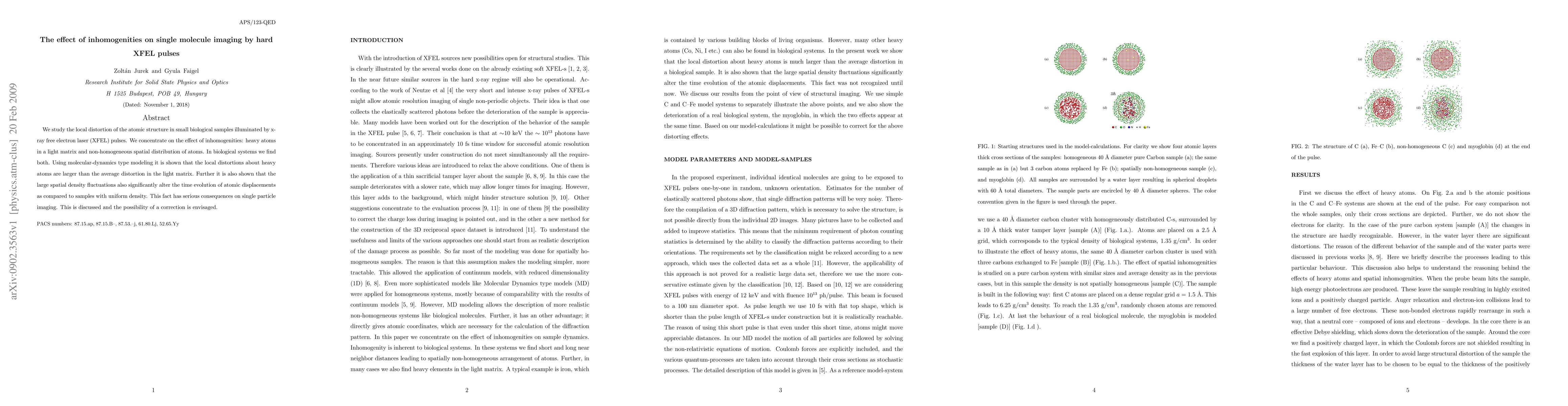 We study the local distortion of the atomic structure in small biological samples illuminated by x-ray free electron laser (XFEL) pulses. We concentrate on the effect of inhomogenities: heavy atoms in a light matrix and non-homogeneous spatial distribution of atoms. In biological systems we find both. Using molecular-dynamics type modeling it is shown that the local distortions about heavy atoms are larger than the average distortion in the light matrix. Further it is also shown that the large spatial density fluctuations also significantly alter the time evolution of atomic displacements as compared to samples with uniform density. This fact has serious consequences on single particle imaging. This is discussed and the possibility of a correction is envisaged.
