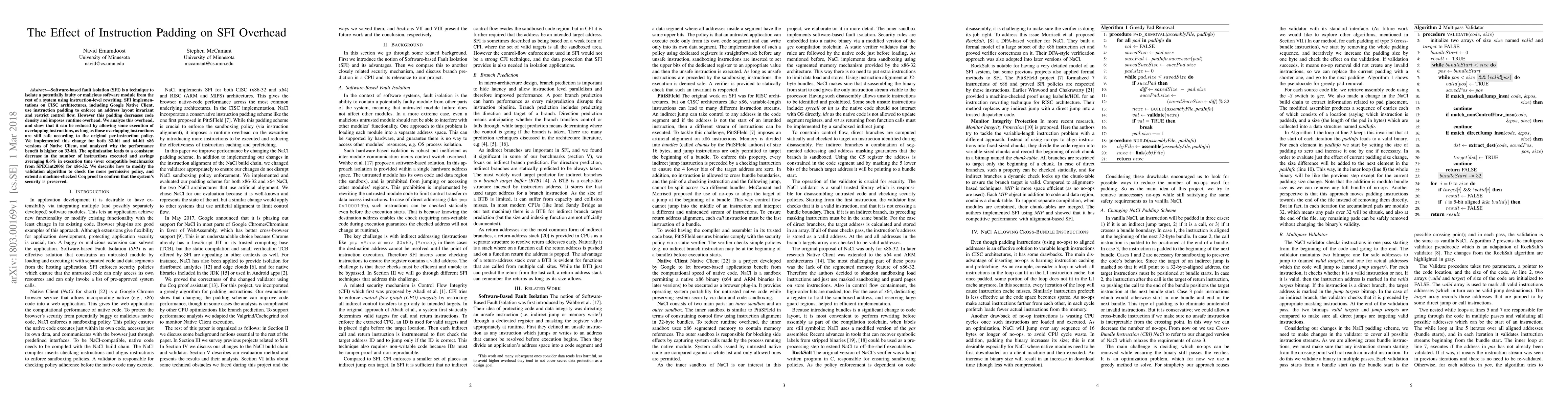 This paper investigates the overhead introduced by instruction padding in software-based fault isolation (SFI) on CISC architectures, demonstrating that allowing some execution of overlapping, safe instructions can reduce this overhead. The optimization resulted in an average 8.6% execution time saving on 32-bit x86 systems, with a modified validation algorithm and machine-checked proof maintaining system security.