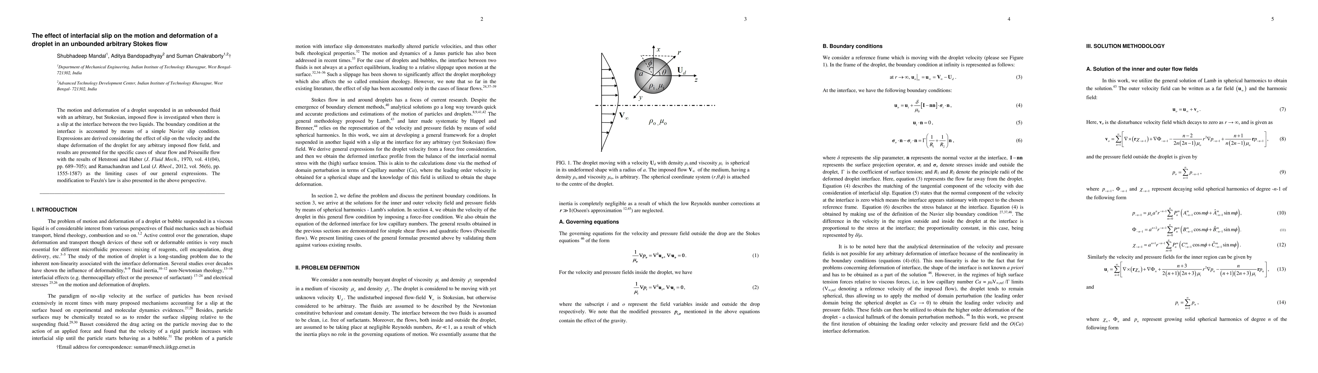 The motion and deformation of a droplet suspended in an unbounded fluid with an arbitrary, but Stokesian, imposed flow is investigated when there is a slip at the interface between the two liquids. The boundary condition at the interface is accounted by means of a simple Navier slip condition. Expressions are derived considering the effect of slip on the velocity and the shape deformation of the droplet for any arbitrary imposed flow field, and results are presented for the specific cases of shear flow and Poiseuille flow with the results of Hetsroni and Haber (J. Fluid Mech., 1970, vol. 41(04), pp. 689-705); and Ramachandran and Leal (J. Rheol., 2012, vol. 56(6), pp. 1555-1587) as the limiting cases of our general expressions. The modification to Fax\'en's law is also presented in the above perspective.