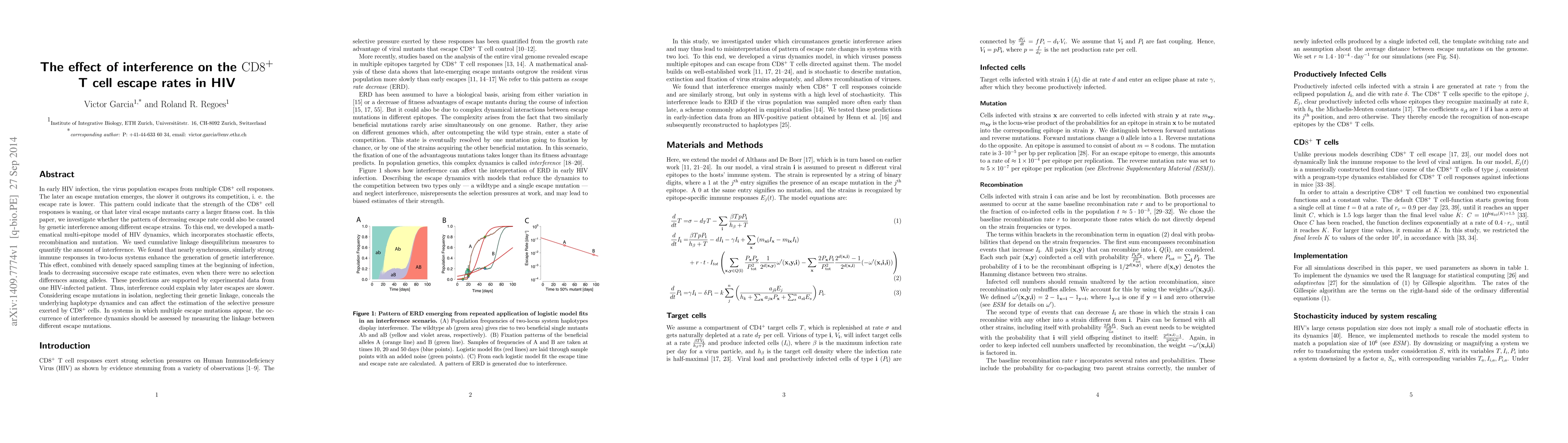 This study investigates how genetic interference among different HIV escape mutations affects the observed CD8+ T cell escape rates. The research found that nearly synchronous strong immune responses can enhance genetic interference, leading to decreasing escape rates even without selection differences, thus highlighting the importance of considering linkage dynamics in estimating CD8+ cell selective pressure.