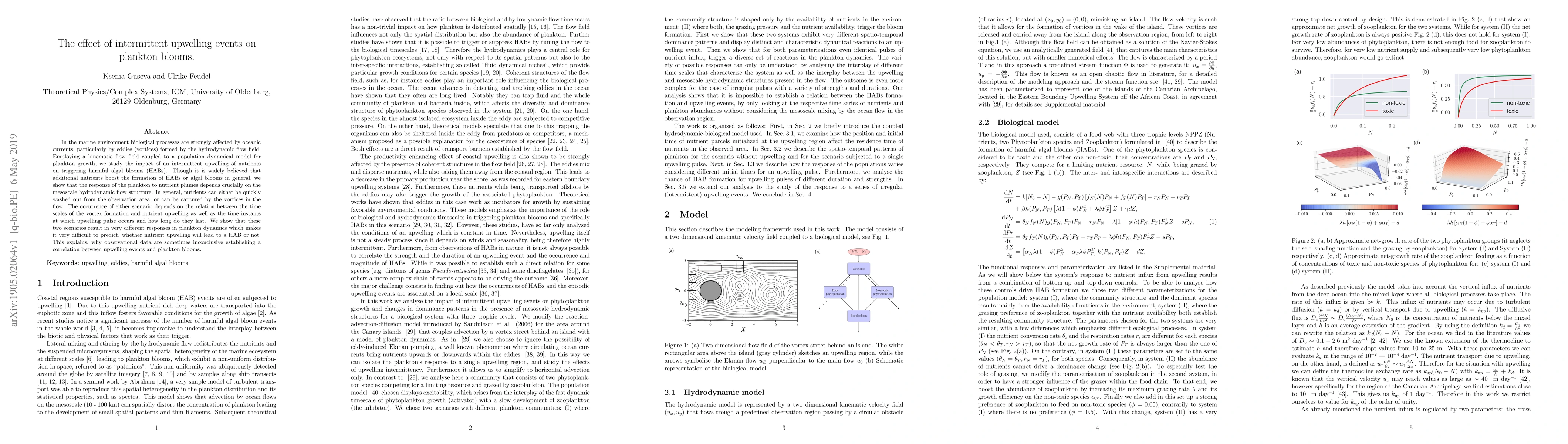 In the marine environment biological processes are strongly affected by oceanic currents, particularly by eddies (vortices) formed by the hydrodynamic flow field. Employing a kinematic flow field coupled to a population dynamical model for plankton growth, we study the impact of an intermittent upwelling of nutrients on triggering harmful algal blooms (HABs). Though it is widely believed that additional nutrients boost the formation of HABs or algal blooms in general, we show that the response of the plankton to nutrient plumes depends crucially on the mesoscale hydrodynamic flow structure. In general nutrients can either be quickly washed out from the observation area, or can be captured by the vortices in the flow. The occurrence of either scenario depends on the relation between the time scales of the vortex formation and nutrient upwelling as well as the time instants at which upwelling pulse occurs and how long do they last. We show that these two scenarios result in very different responses in plankton dynamics which makes it very difficult to predict, whether nutrient upwelling will lead to a HAB or not. This explains, why observational data are sometimes inconclusive establishing a correlation between upwelling events and plankton blooms.
