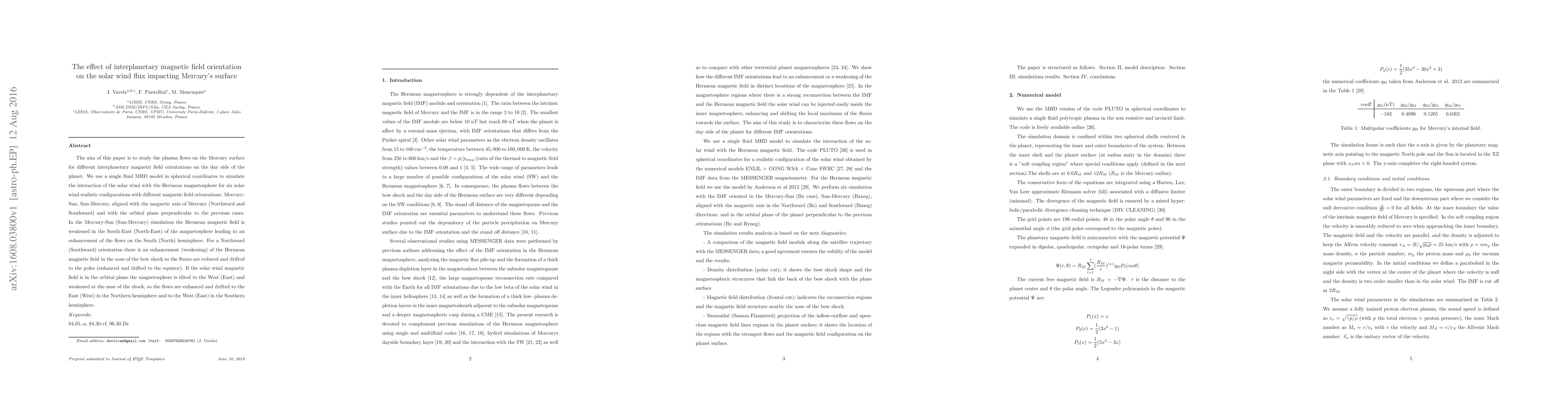 This paper investigates the influence of different interplanetary magnetic field orientations on plasma flows impacting Mercury's surface using a single fluid MHD model. Results show varied magnetic field strengths and plasma flow directions depending on the orientation, with significant effects on the planet's magnetosphere.