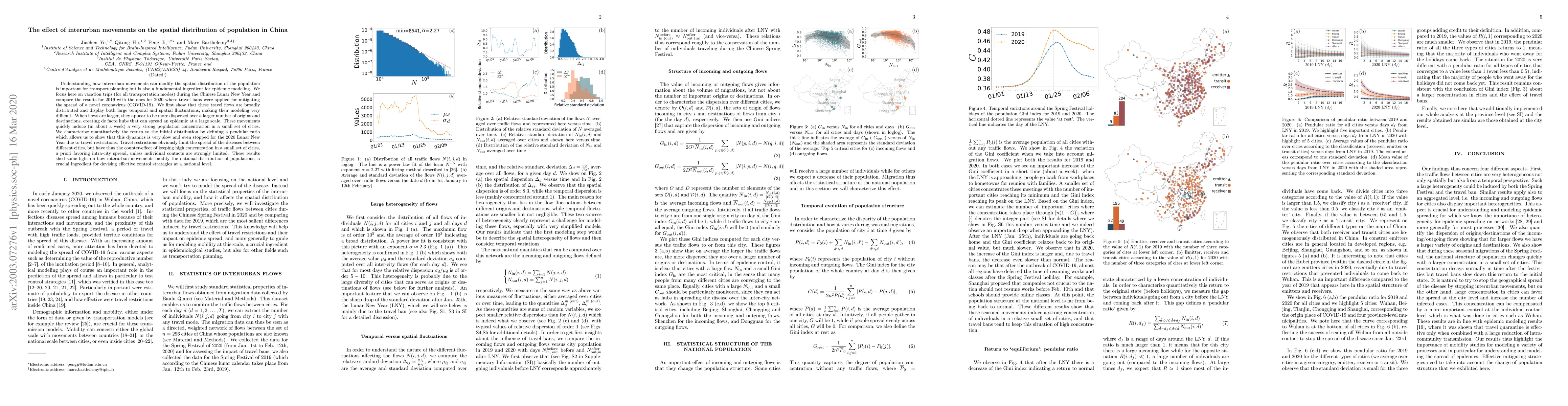 Understanding how interurban movements can modify the spatial distribution of the population is important for transport planning but is also a fundamental ingredient for epidemic modeling. We focus here on vacation trips (for all transportation modes) during the Chinese Lunar New Year and compare the results for 2019 with the ones for 2020 where travel bans were applied for mitigating the spread of a novel coronavirus (COVID-19). We first show that these travel flows are broadly distributed and display both large temporal and spatial fluctuations, making their modeling very difficult. When flows are larger, they appear to be more dispersed over a larger number of origins and destinations, creating de facto hubs that can spread an epidemic at a large scale. These movements quickly induce (in about a week) a very strong population concentration in a small set of cities. We characterize quantitatively the return to the initial distribution by defining a pendular ratio which allows us to show that this dynamics is very slow and even stopped for the 2020 Lunar New Year due to travel restrictions. Travel restrictions obviously limit the spread of the diseases between different cities, but have thus the counter-effect of keeping high concentration in a small set of cities, a priori favoring intra-city spread, unless individual contacts are strongly limited. These results shed some light on how interurban movements modify the national distribution of populations, a crucial ingredient for devising effective control strategies at a national level.