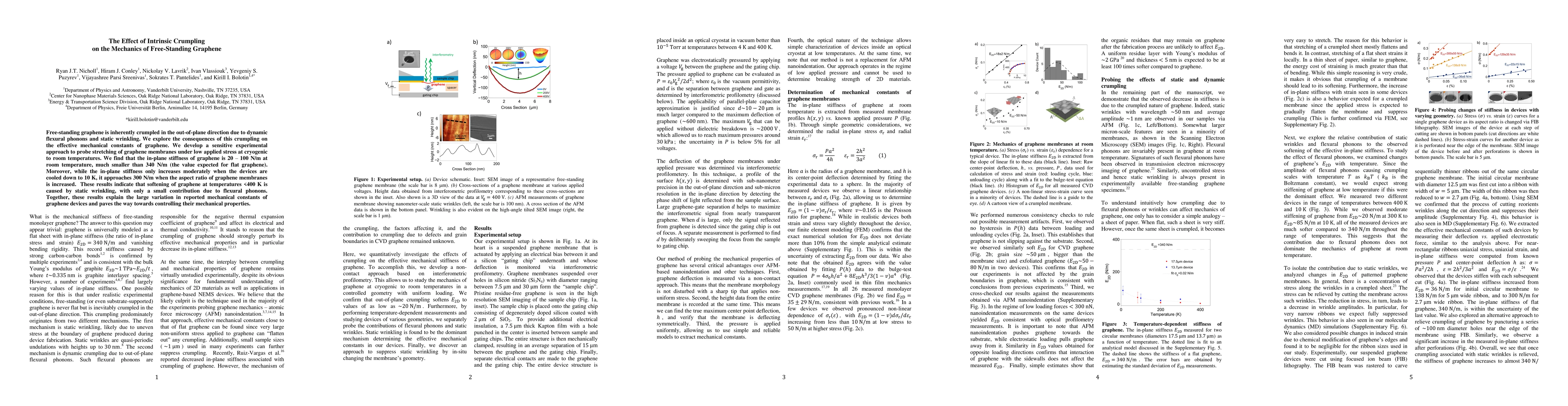 Free-standing graphene is inherently crumpled in the out-of-plane direction due to dynamic flexural phonons and static wrinkling. We explore the consequences of this crumpling on the effective mechanical constants of graphene. We develop a sensitive experimental approach to probe stretching of graphene membranes under low applied stress at cryogenic to room temperatures. We find that the in-plane stiffness of graphene is between 20 and 100 N/m at room temperature, much smaller than 340 N/m (the value expected for flat graphene). Moreover, while the in-plane stiffness only increases moderately when the devices are cooled down to 10 K, it approaches 300 N/m when the aspect ratio of graphene membranes is increased. These results indicate that softening of graphene at temperatures less than 400 K is caused by static wrinkling, with only a small contribution due to flexural phonons. Together, these results explain the large variation in reported mechanical constants of graphene devices and paves the way towards controlling their mechanical properties.