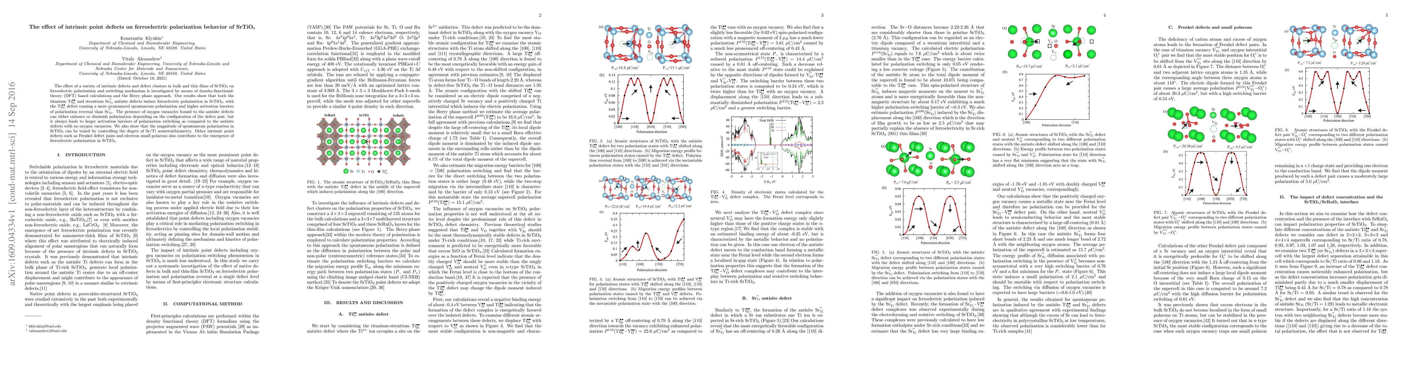 This study investigates how intrinsic point defects in SrTiO$_3$ affect its ferroelectric polarization using DFT calculations and the Berry phase approach. The Ti$_\mathrm{Sr}^{\bullet \bullet}$ defect induces stronger spontaneous polarization and higher switching barriers compared to Sr$_\mathrm{Ti}^{"}$. Oxygen vacancies bound to antisite defects can modify polarization and always increase switching barriers.